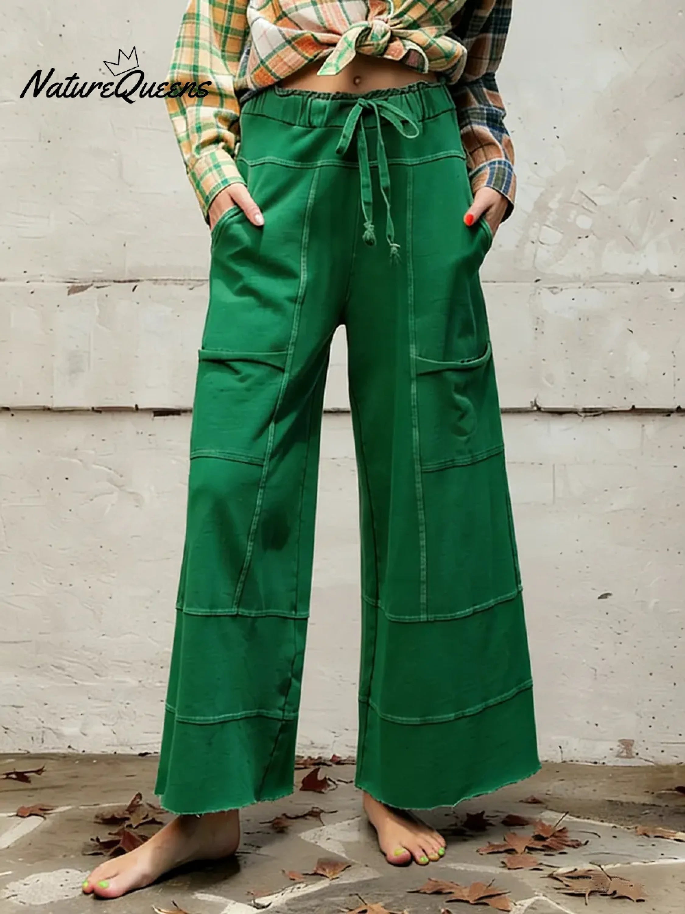 Women's Solid Color High-waisted Drawstring Wide-leg Pants Made Of Cotton And Linen Blend.