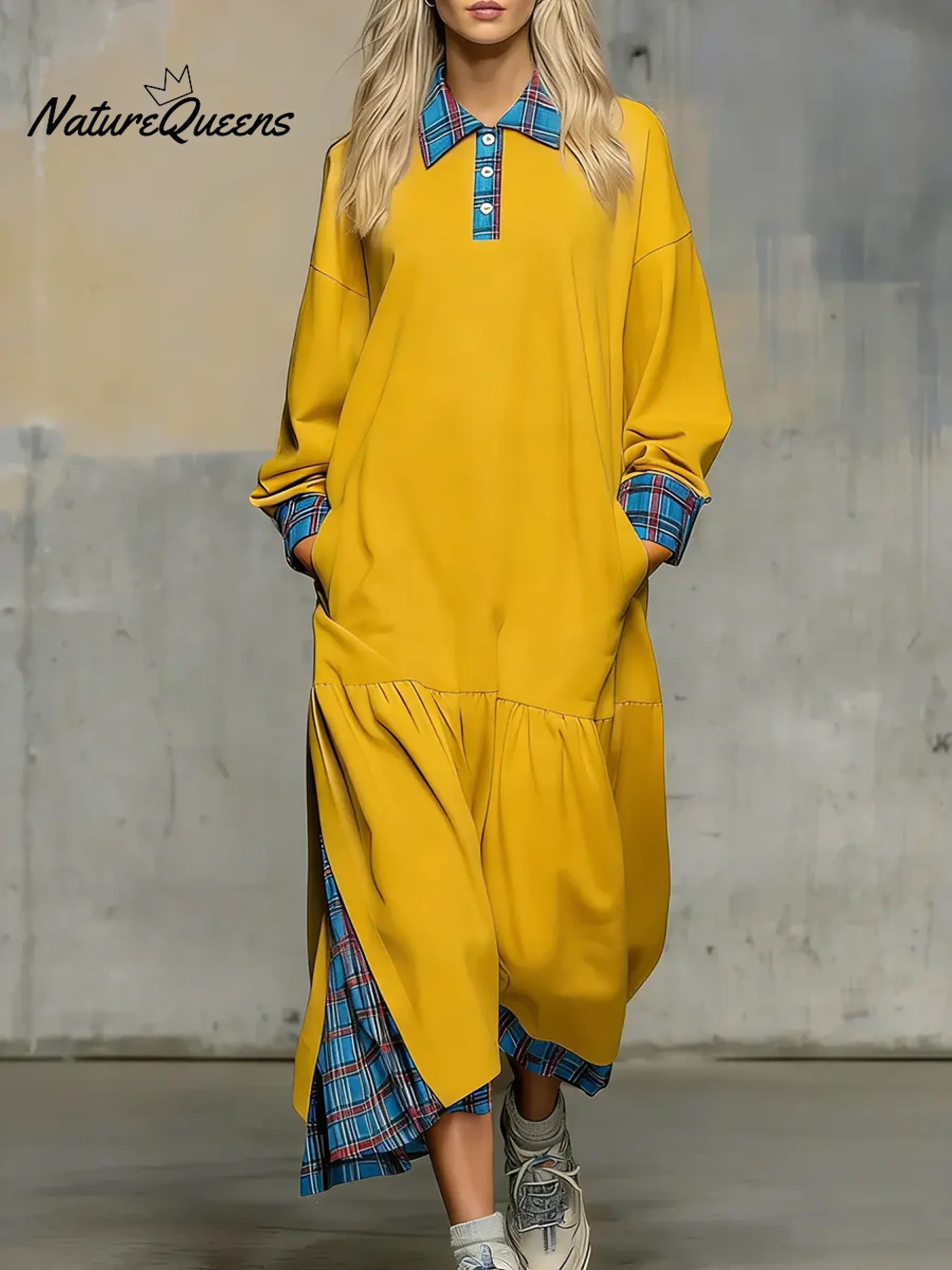 Women's Solid Color Patchwork Plaid Print Shirt Collar Long-sleeved Casual Loose Dress