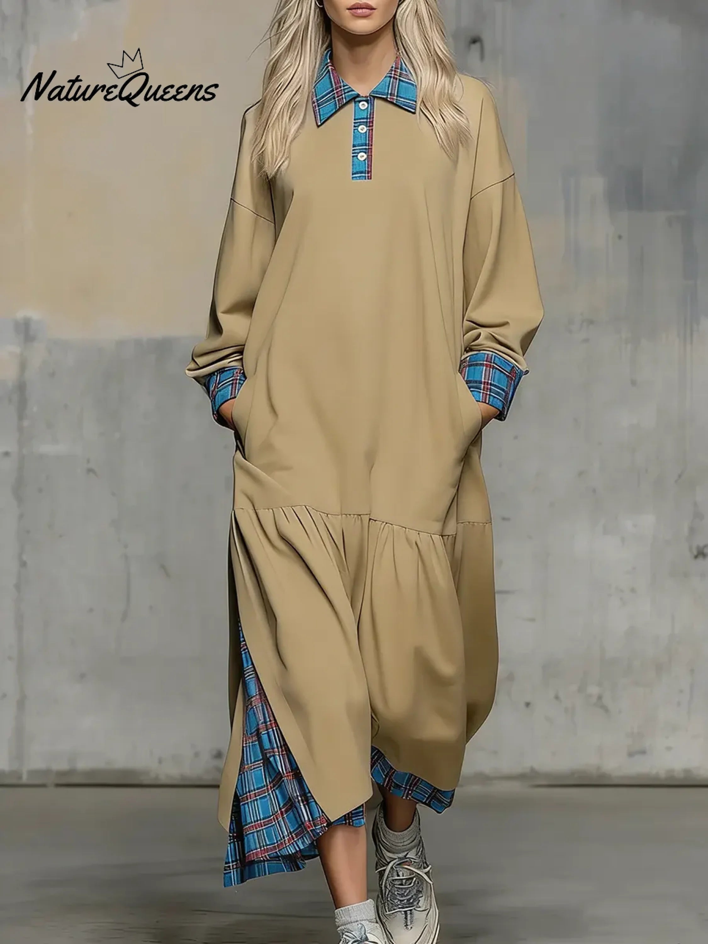 Women's Solid Color Patchwork Plaid Print Shirt Collar Long-sleeved Casual Loose DressWomen's Solid Color Patchwork Plaid Print Shirt Collar Long-sleeved Casual Loose Dress