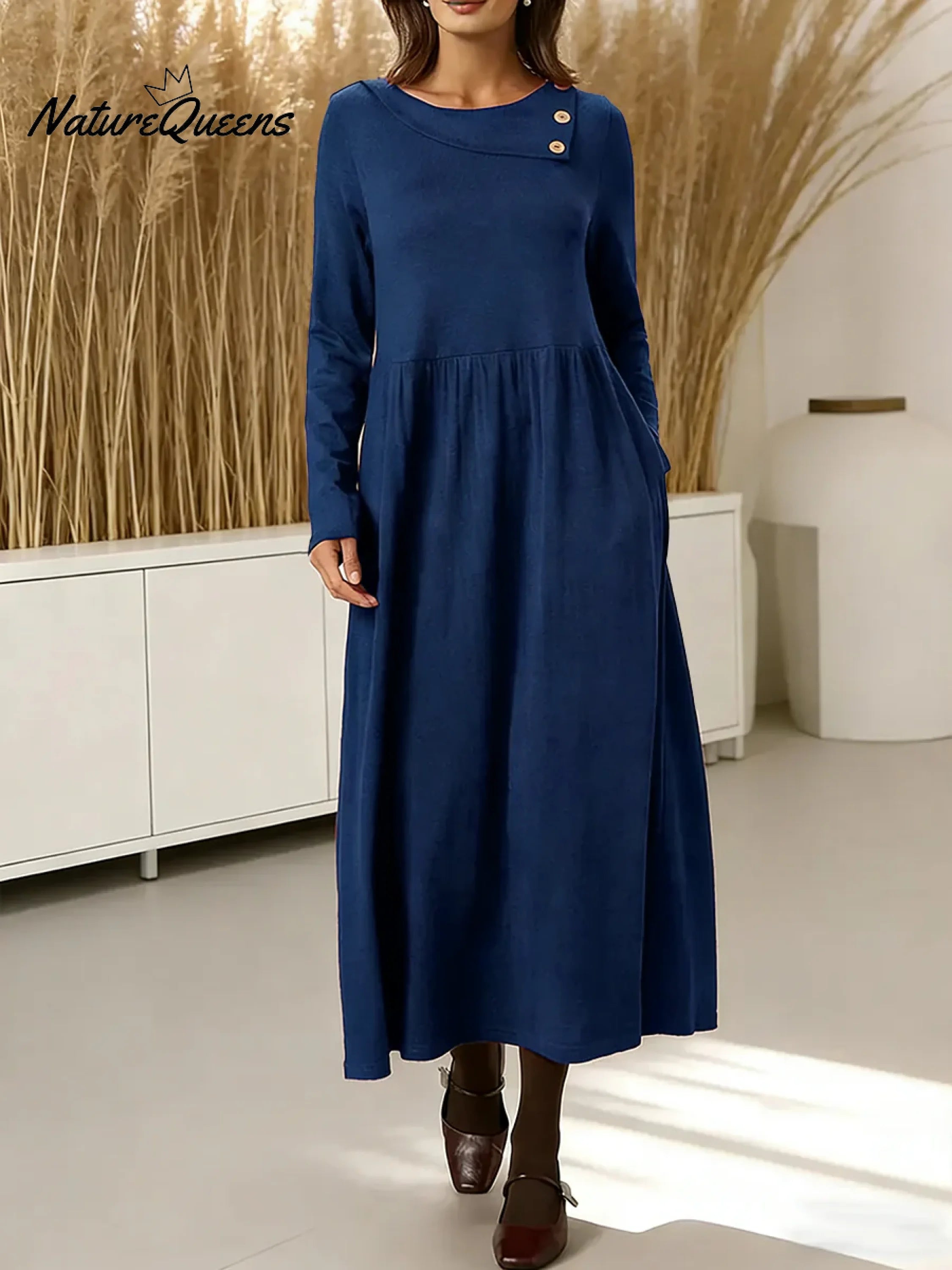 Women's Solid Color Round Neck Long Sleeve Casual Loose Cotton Dress