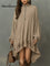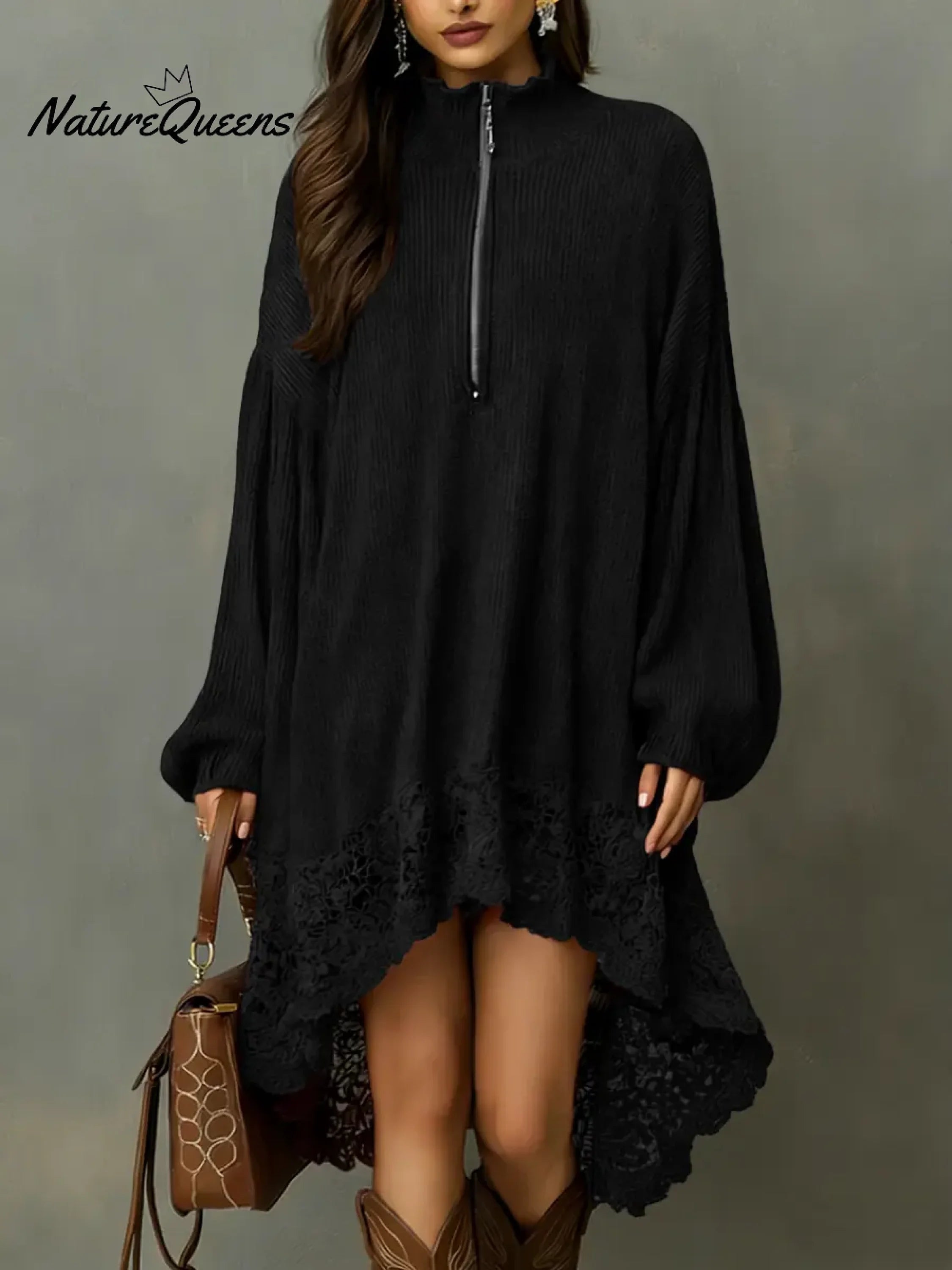 Women's Solid Color Stand-collar Long-sleeved Casual Loose Knit Dress With Lace Trim.