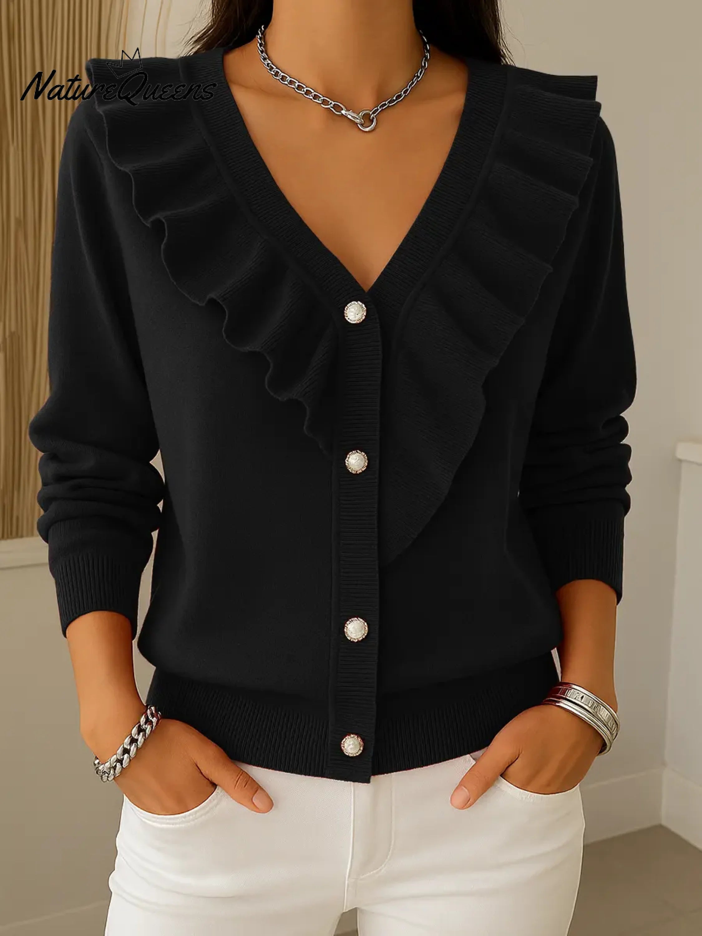 Women's Solid Color V-neck Long Sleeve Casual Loose Ruffled Knit Cardigan
