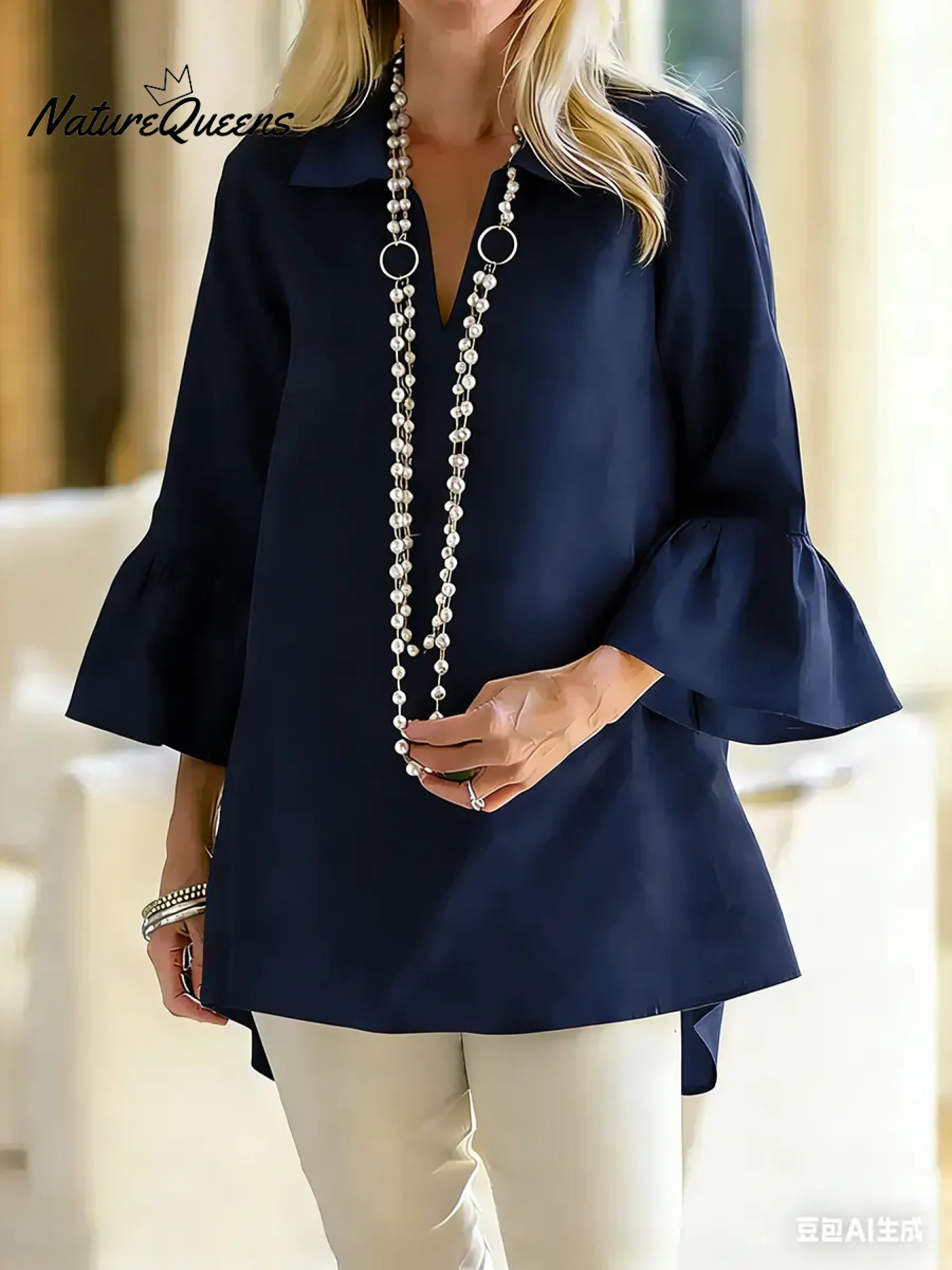 Women's Solid Color V-neck Three-quarter Sleeve Casual Loose Cotton And Linen Top