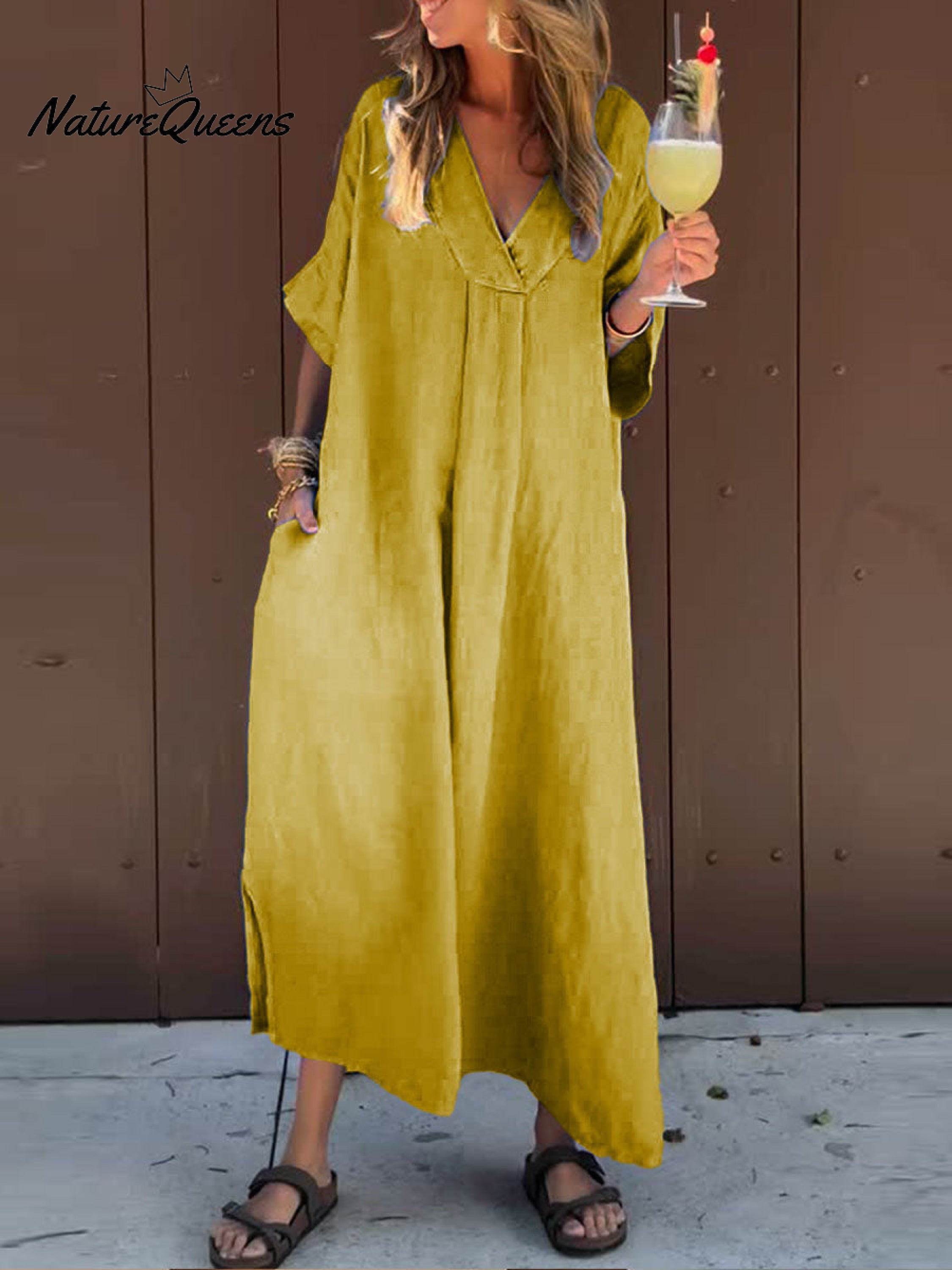 Women's Solid V Neck Pocket Casual Cotton Dress