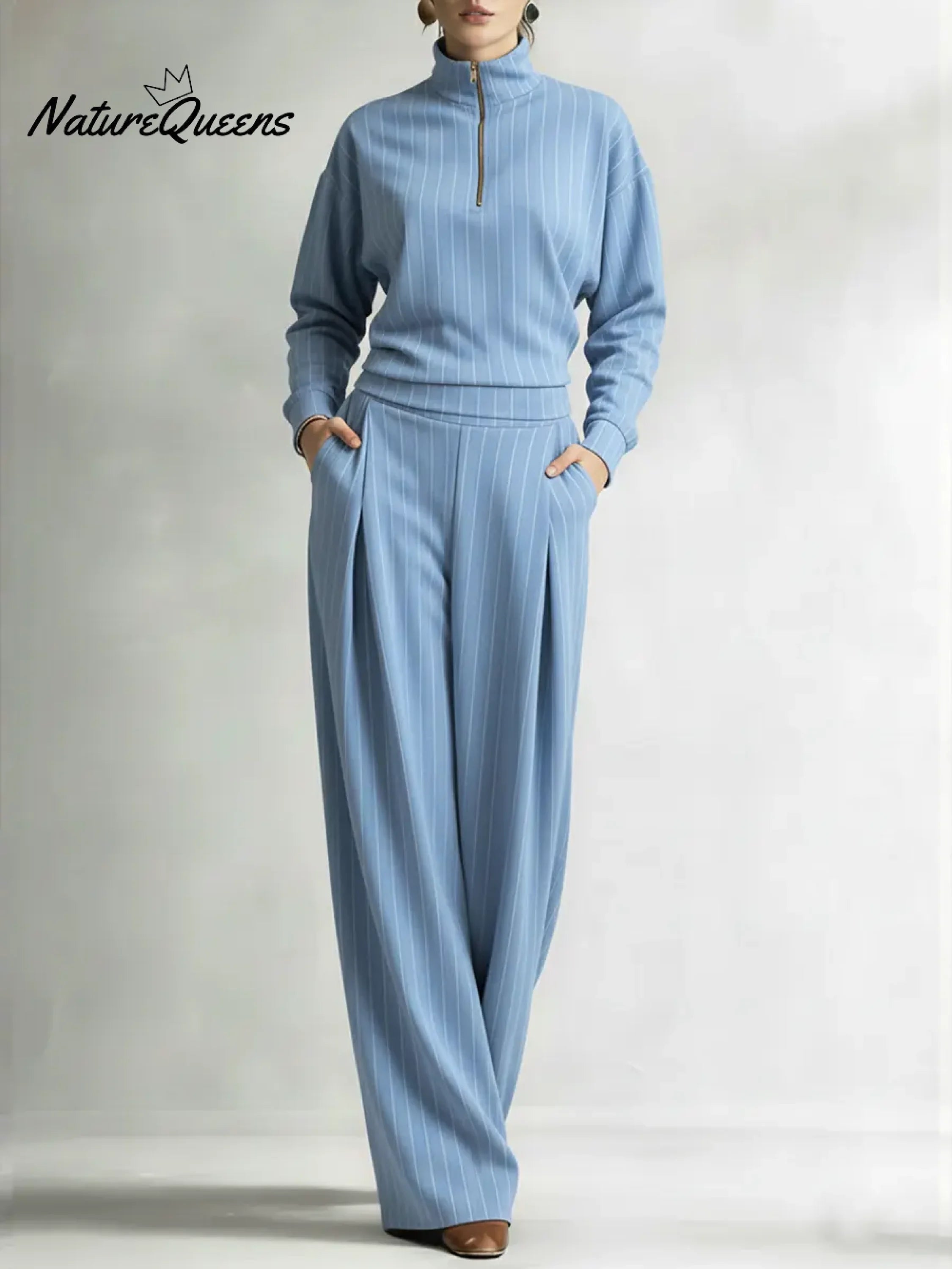 Women's Striped Stretch Cotton Half-zip Top And Wide-leg Pants Two-piece Set