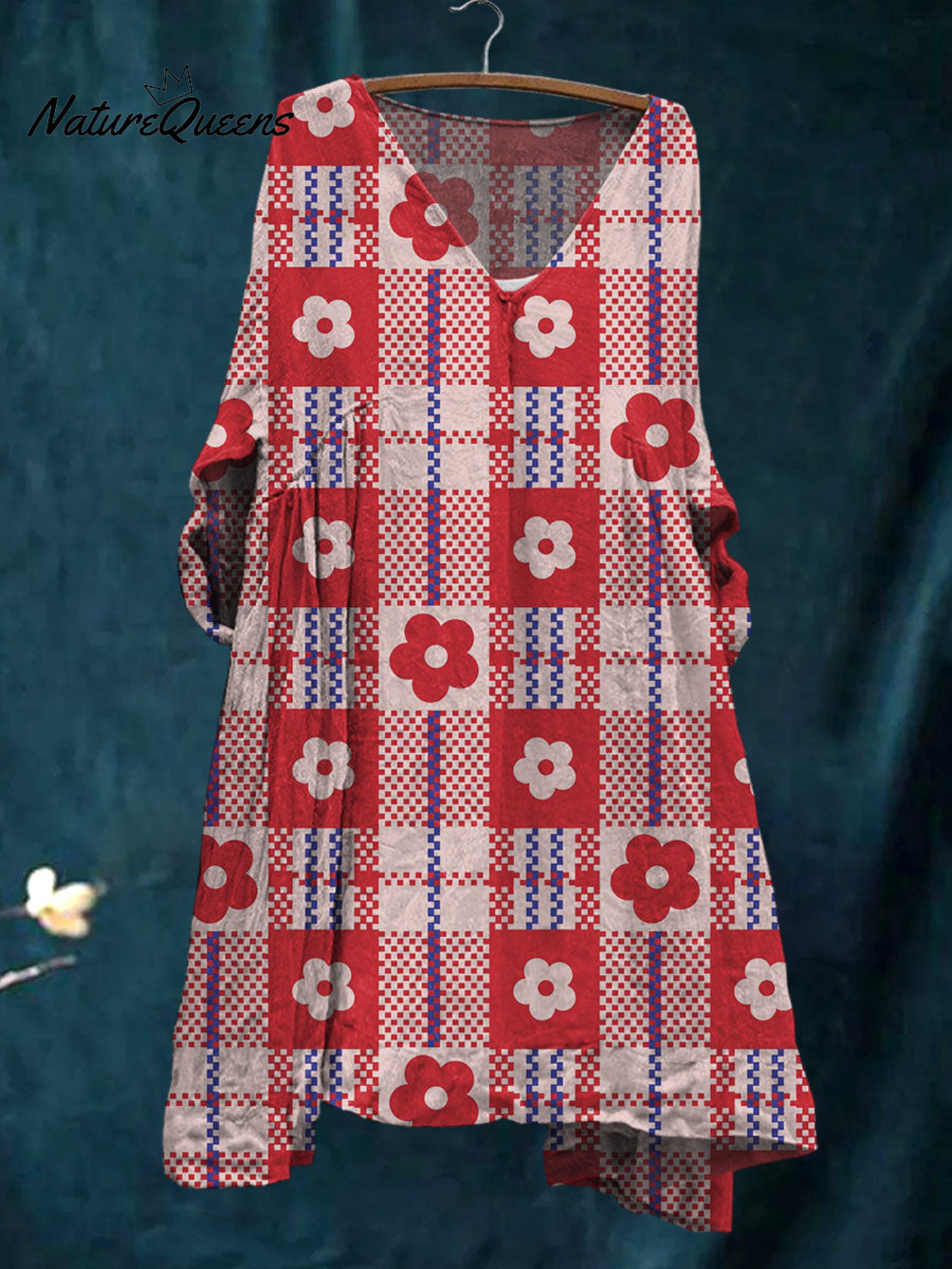 Women's Trellis Floral Art Print Pocket V-neck Cotton Dress