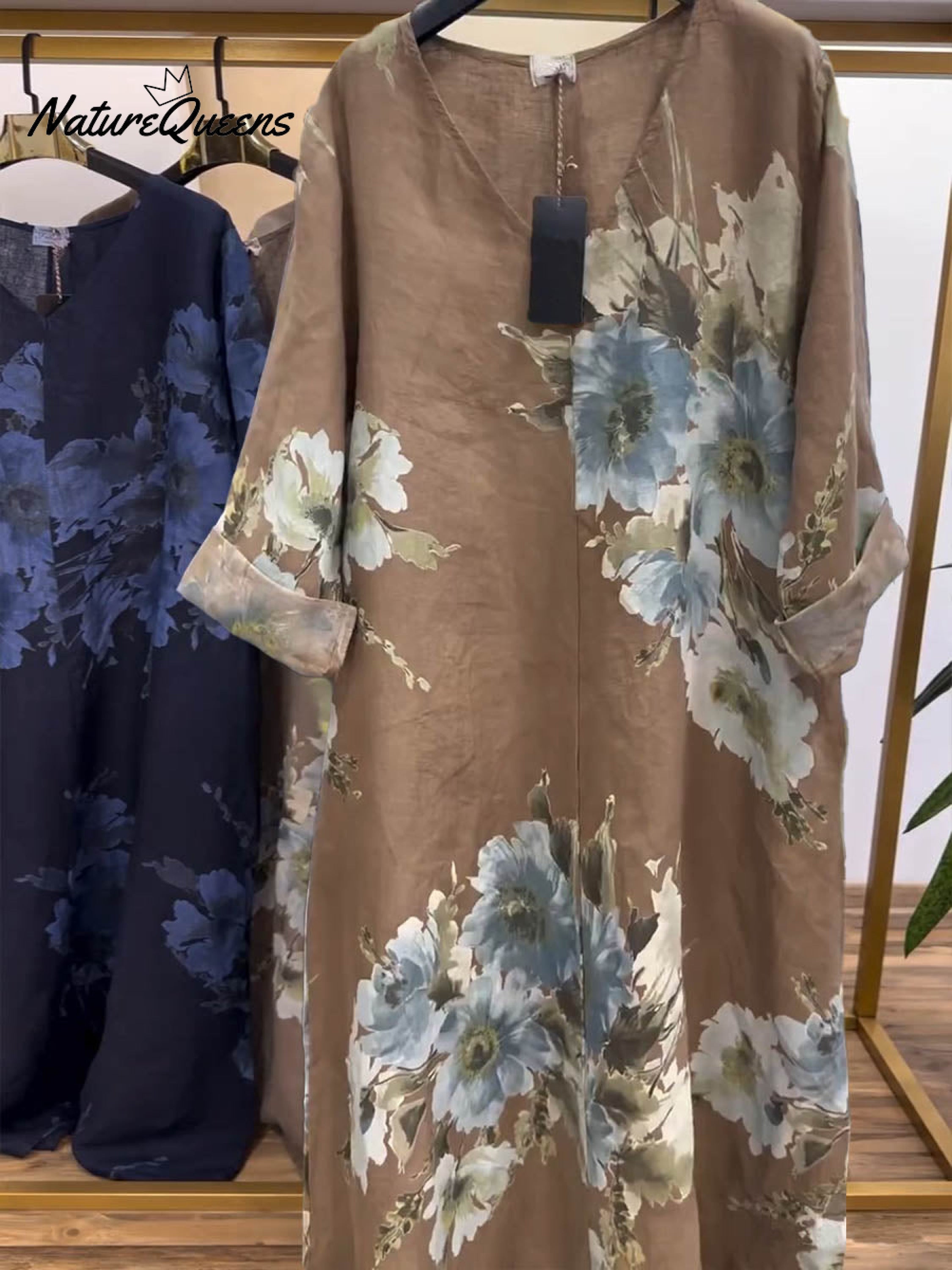 Women's V-neck Long Sleeve Casual Loose Retro Printed Cotton and Linen Dress