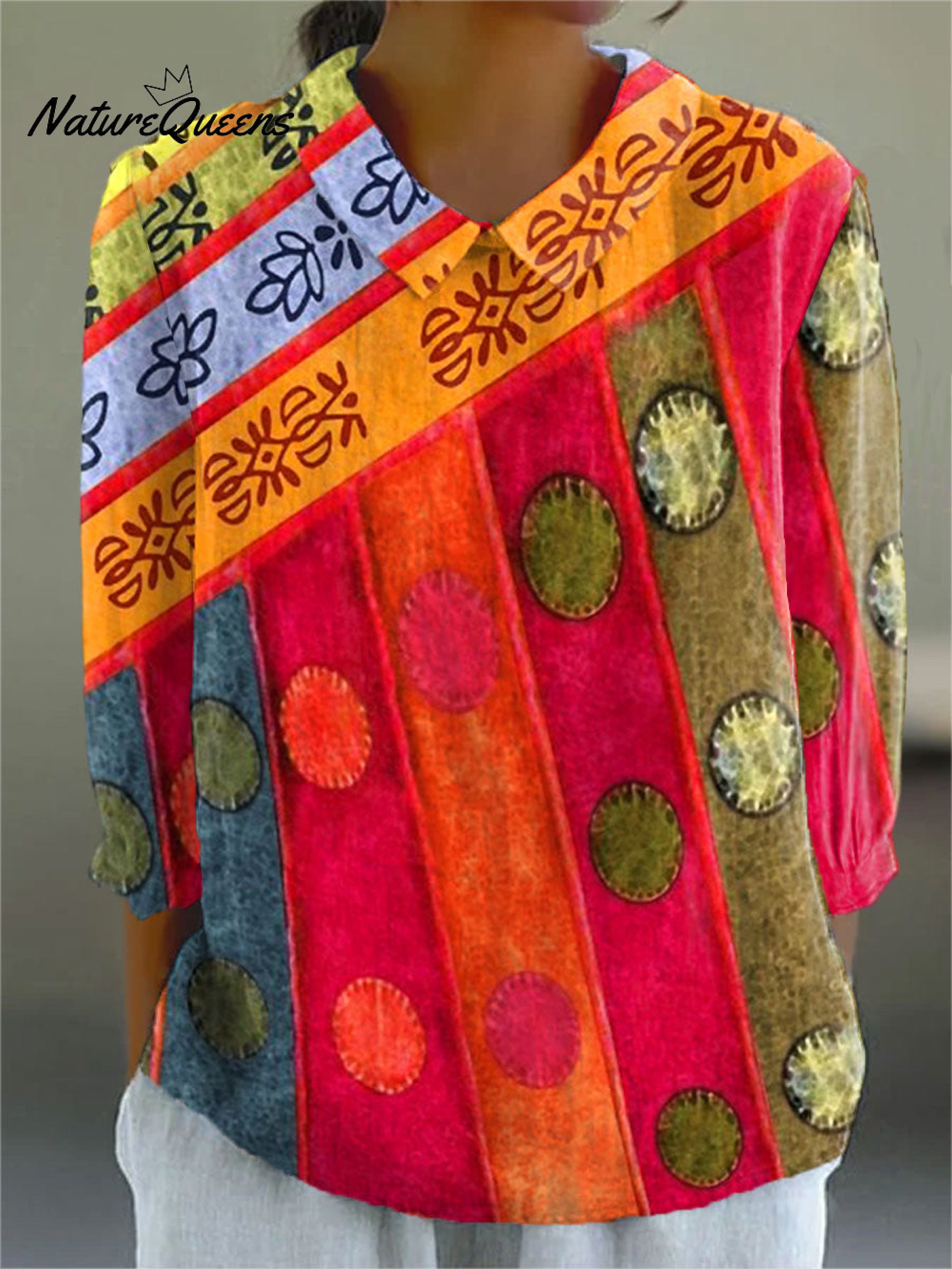 Women's Vintage Abstract Geometry Art Print Casual Cotton And Linen 3/4 Sleeve Shirt
