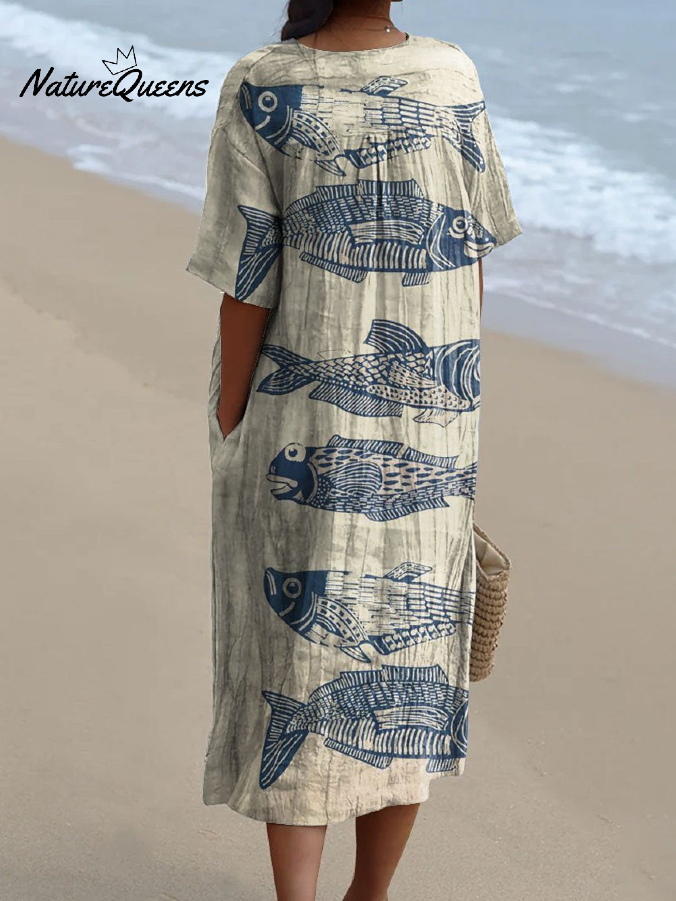 Women's Vintage Lovely Fish Art Print Flowy Dress