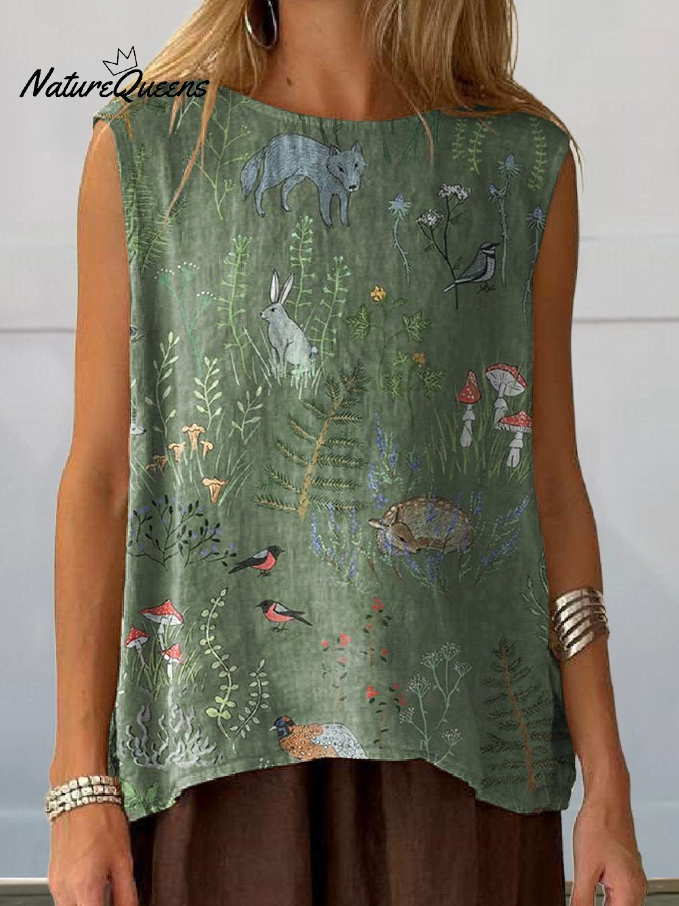 Woodland And Animal Pattern Printed Women's Casual Cotton And Linen Tank Top