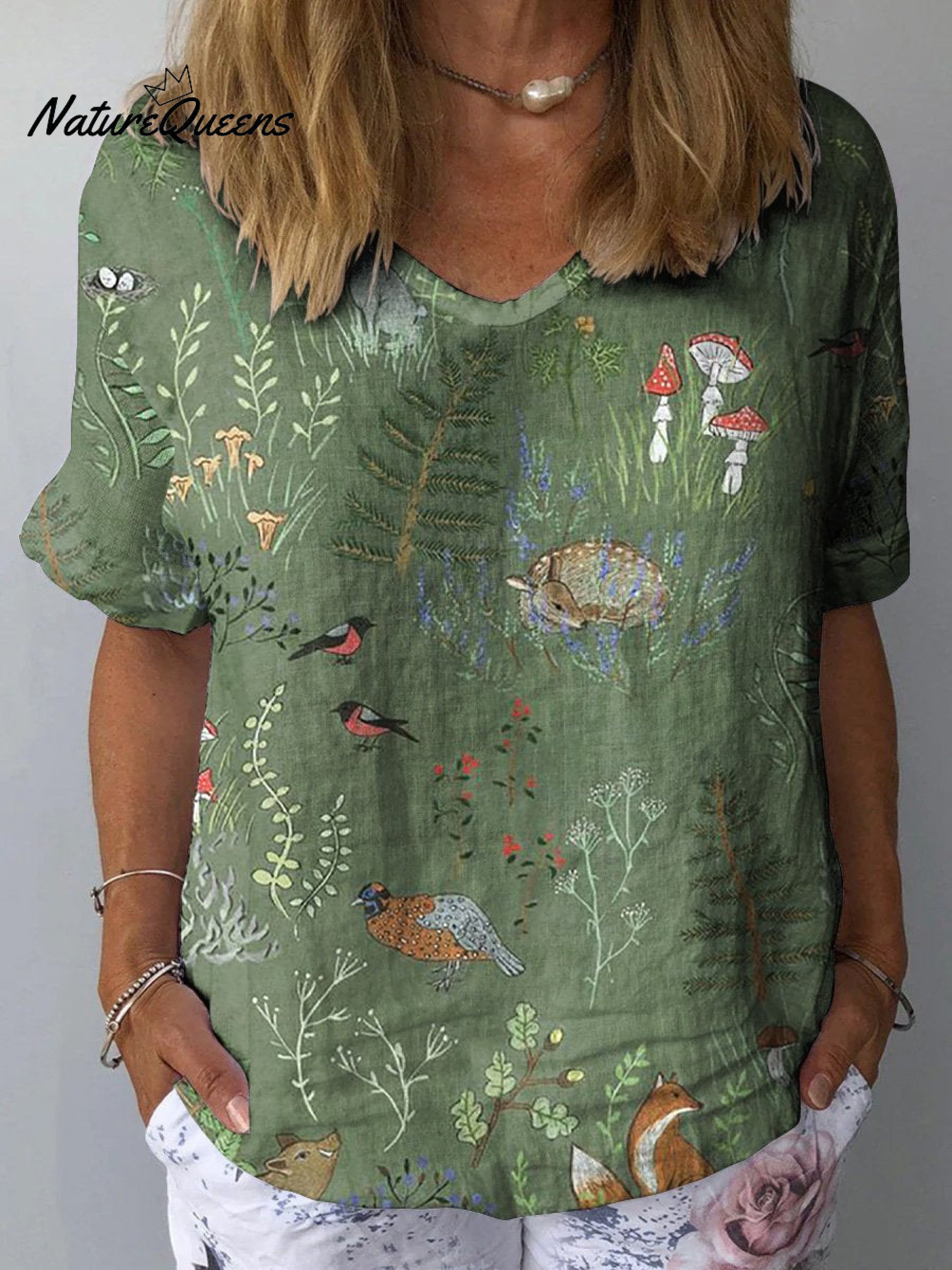 Woodland And Animals Pattern Printed Women's Casual Cotton And Linen Shirt