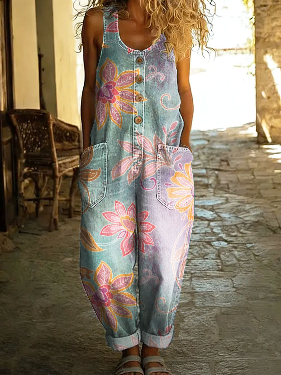 Women's Minimalist Geometric Abstract Casual Cotton Vest Denim Jumpsuit