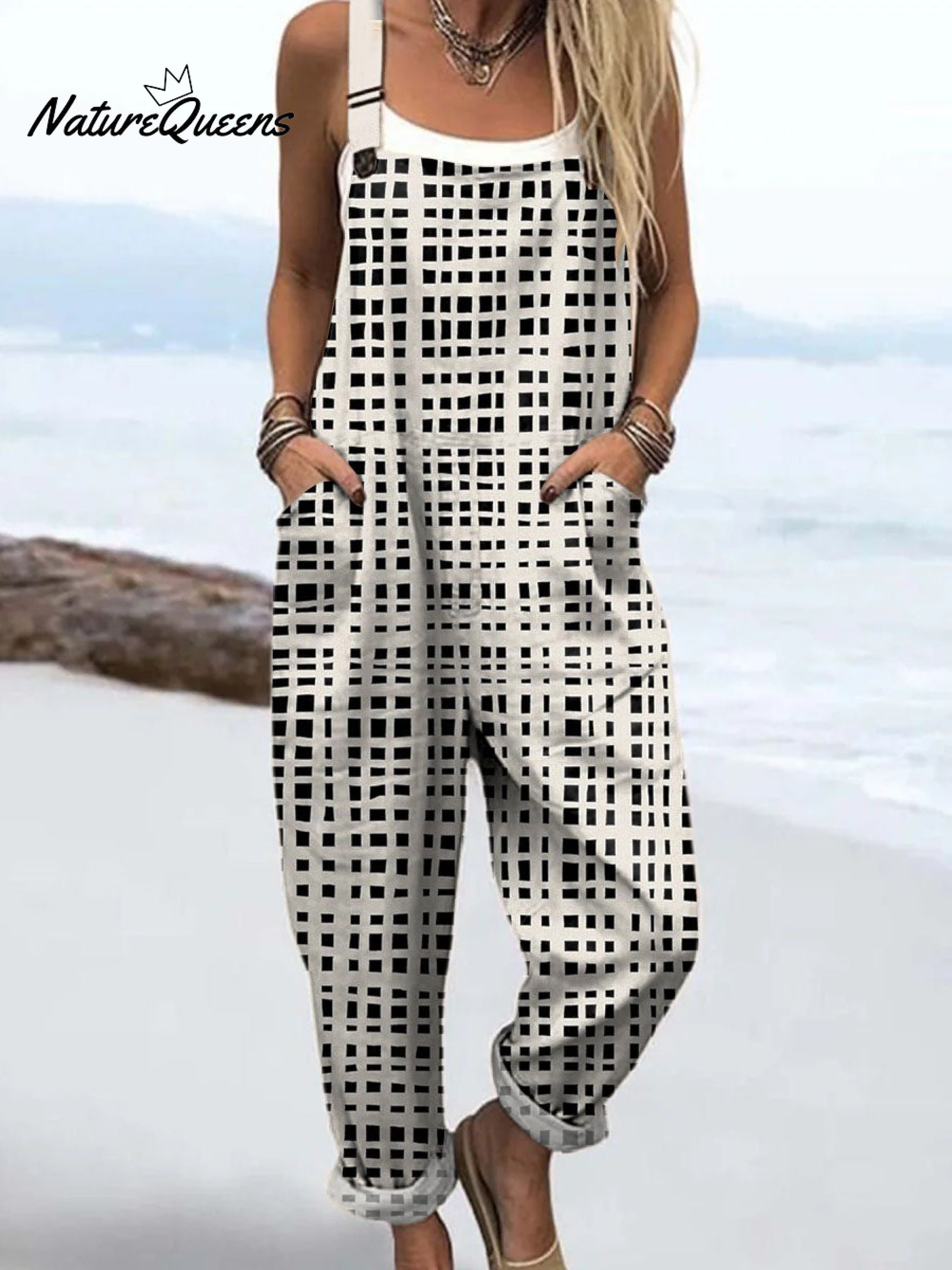 Women's Plaid Pattern Art Print Casual 100% Cotton Wide Leg Jumpsuit