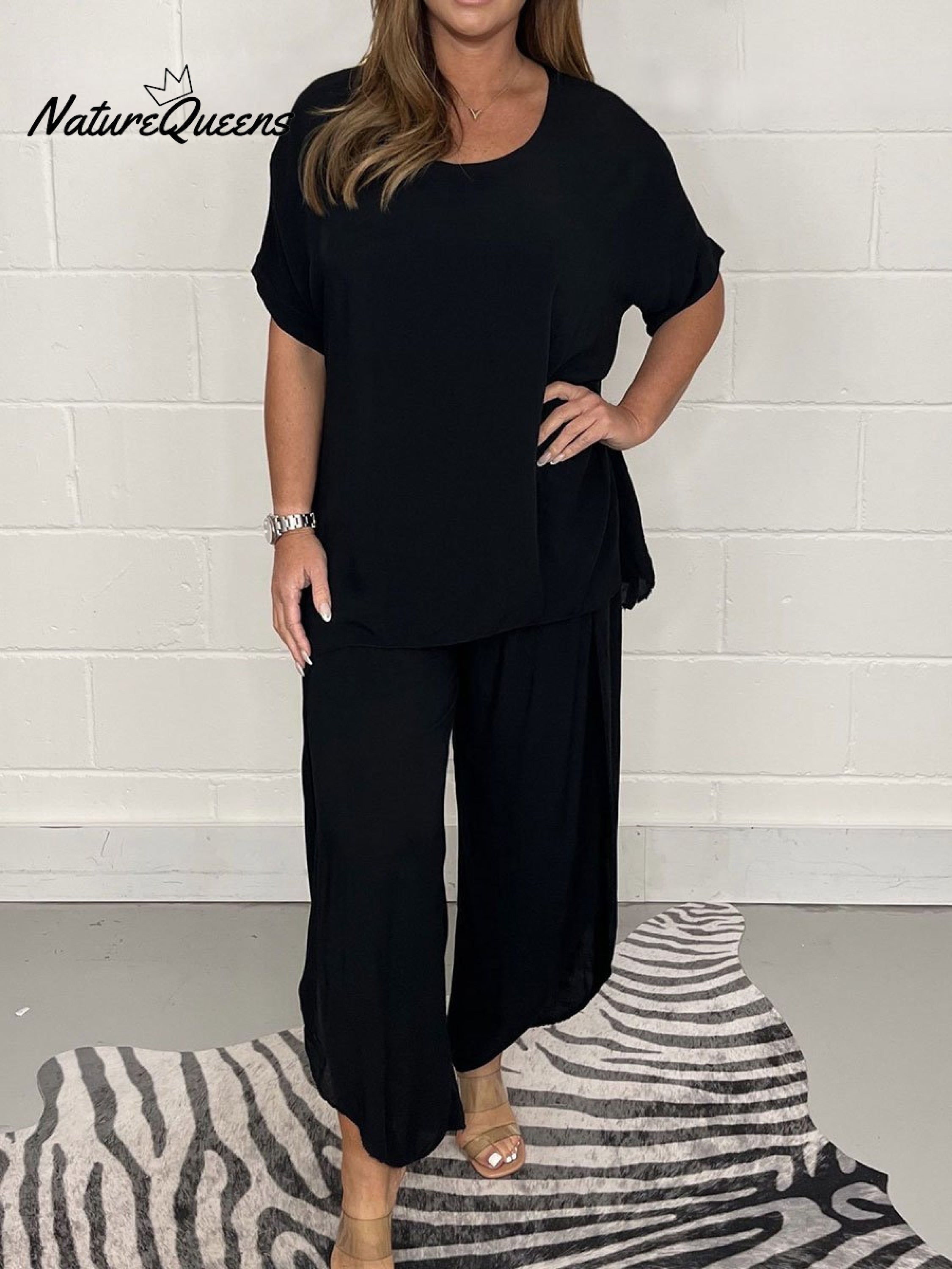 Women's Solid Color Cotton And Linen Short-sleeved Two-piece Suit