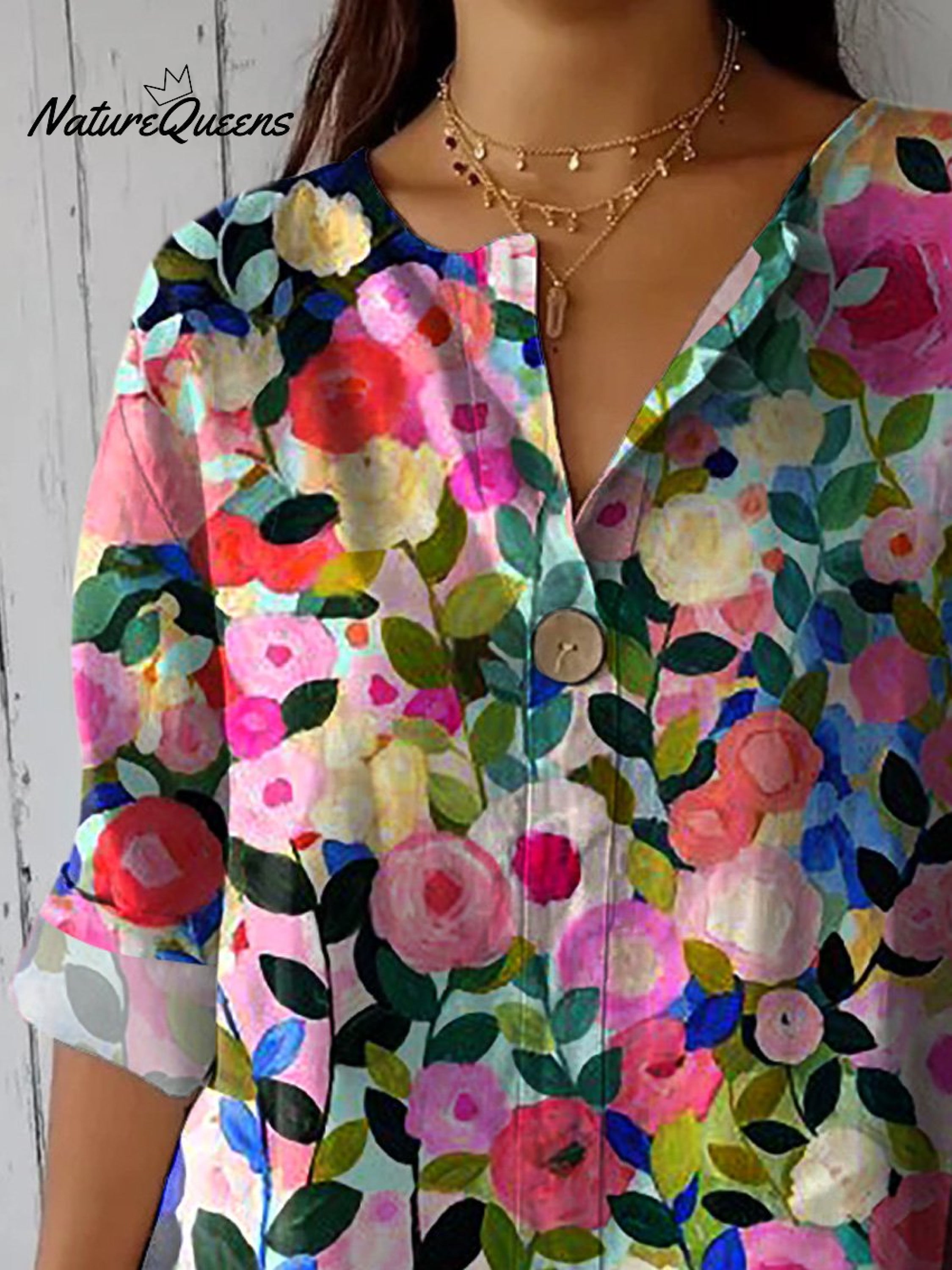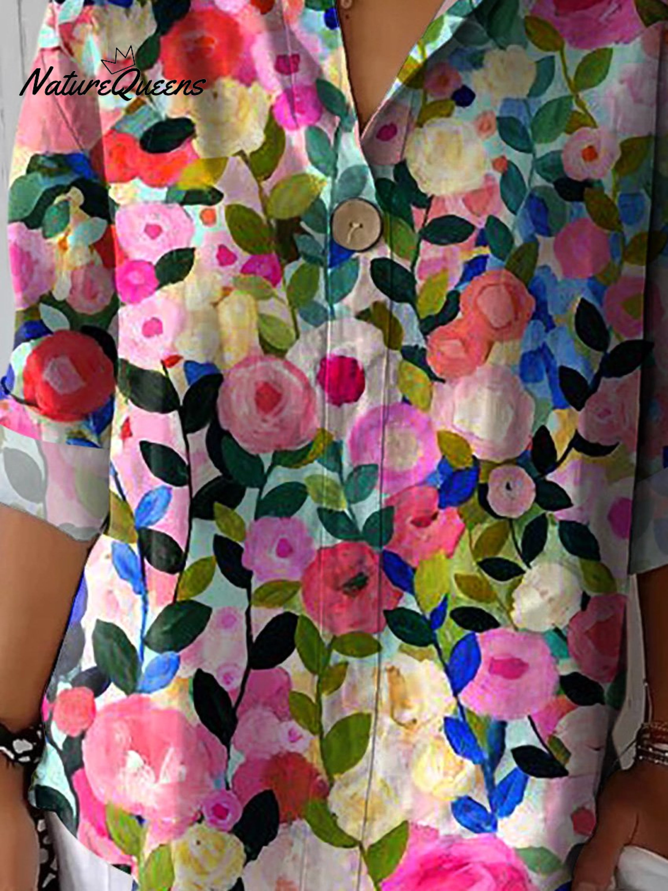 Colorful Spring Floral Garden Printed Women's Casual Cotton Linen Shirt