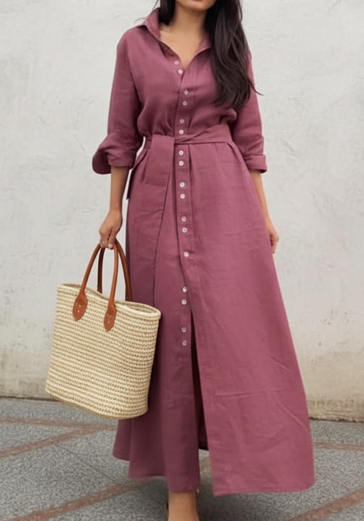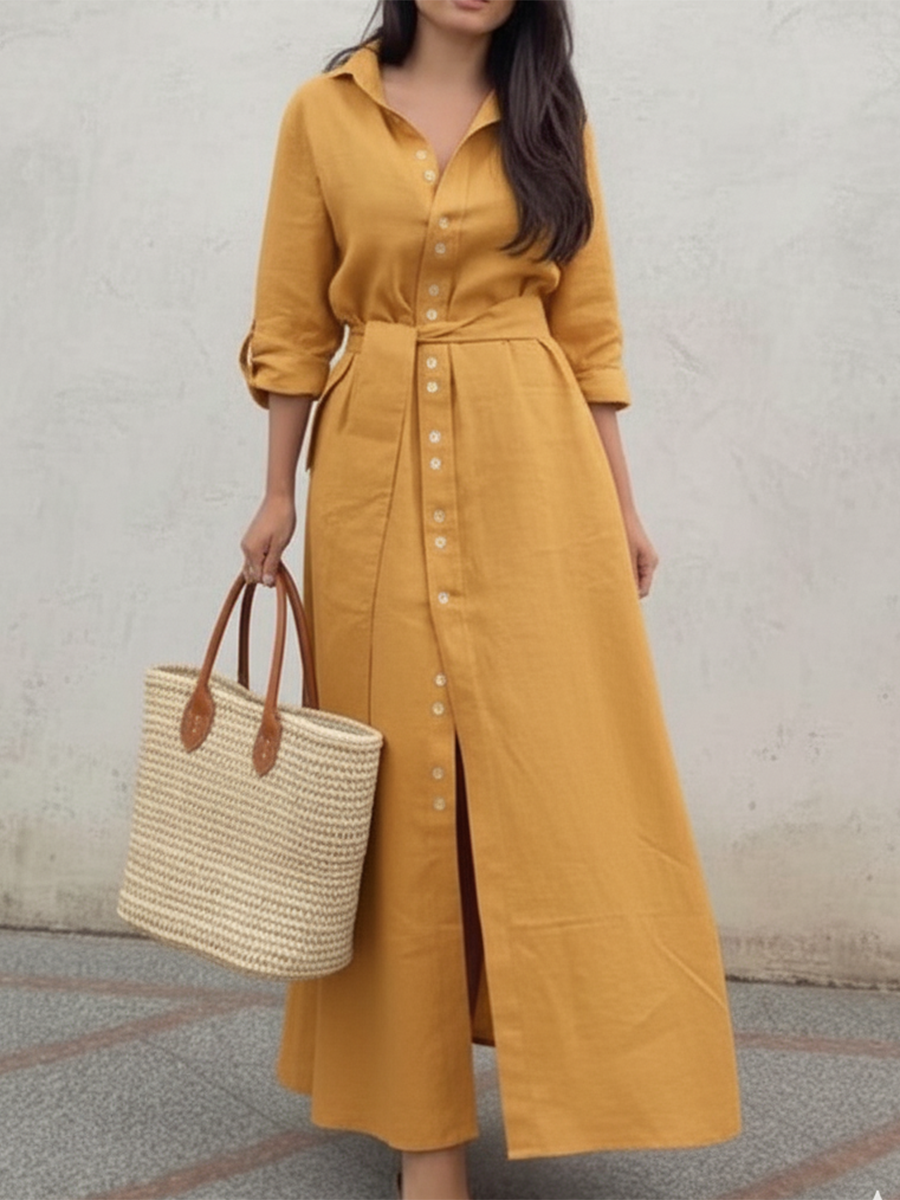 Classic Stand-up Collar Button-down Linen Maxi Dress