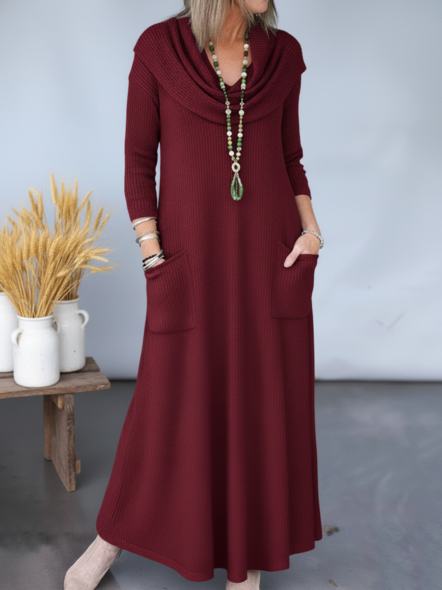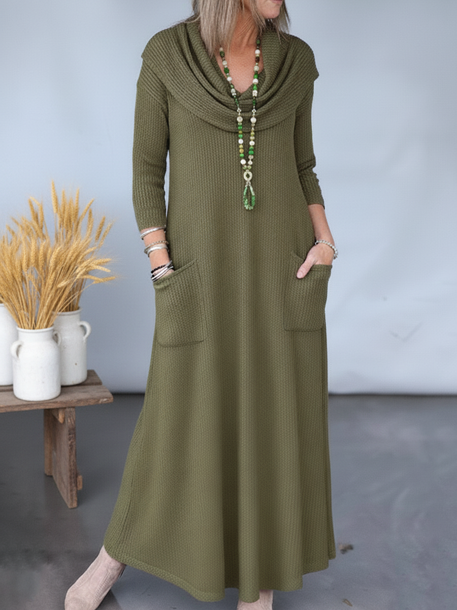 Elegant Cowl Neck Solid Color A-line Pocket Knit Maxi Dress