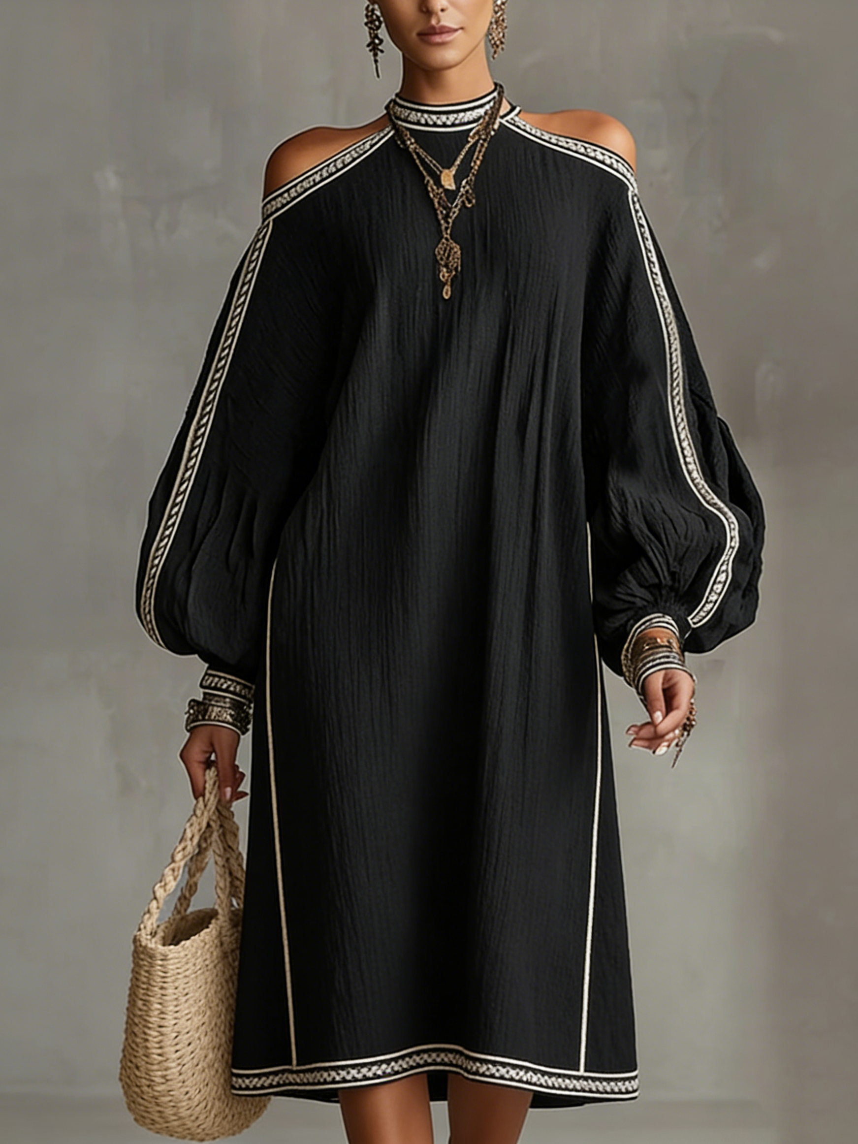 Elegant Off-shoulder Lantern Sleeve Loose Linen Cotton Dress