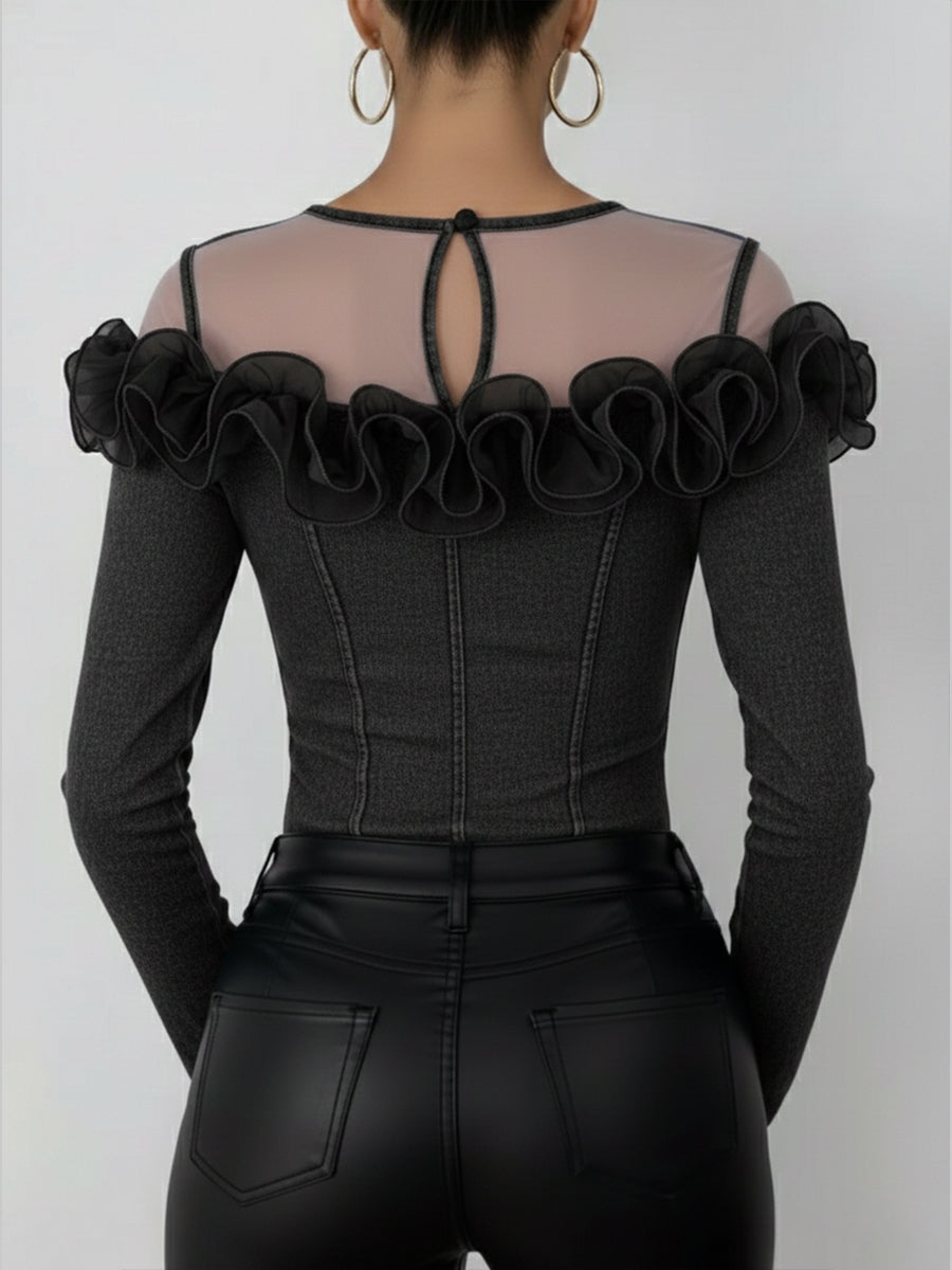 Fashionable Patchwork Mesh Organza Ruffled Denim Top