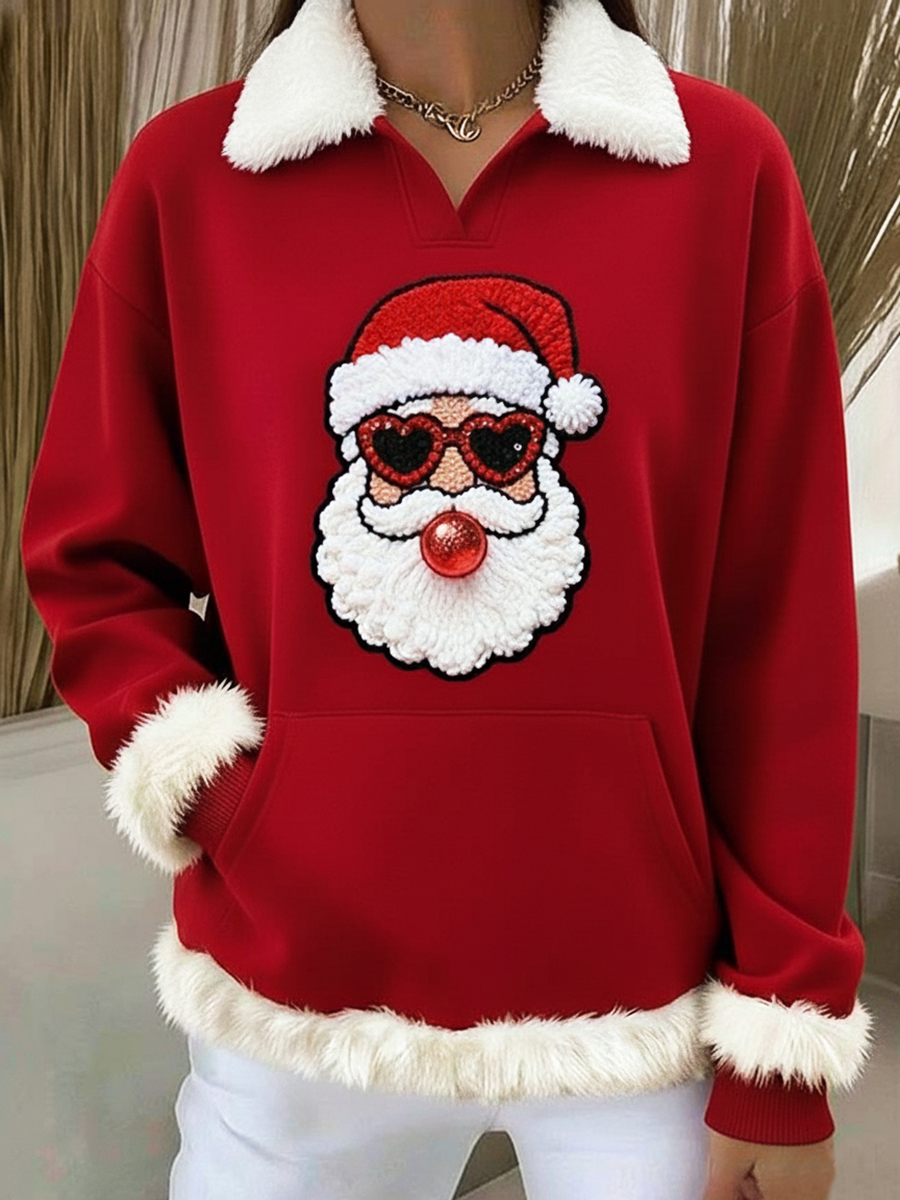 Vintage Santa Claus Print Faux Rabbit Fur Collar Lapel Sweatshirt