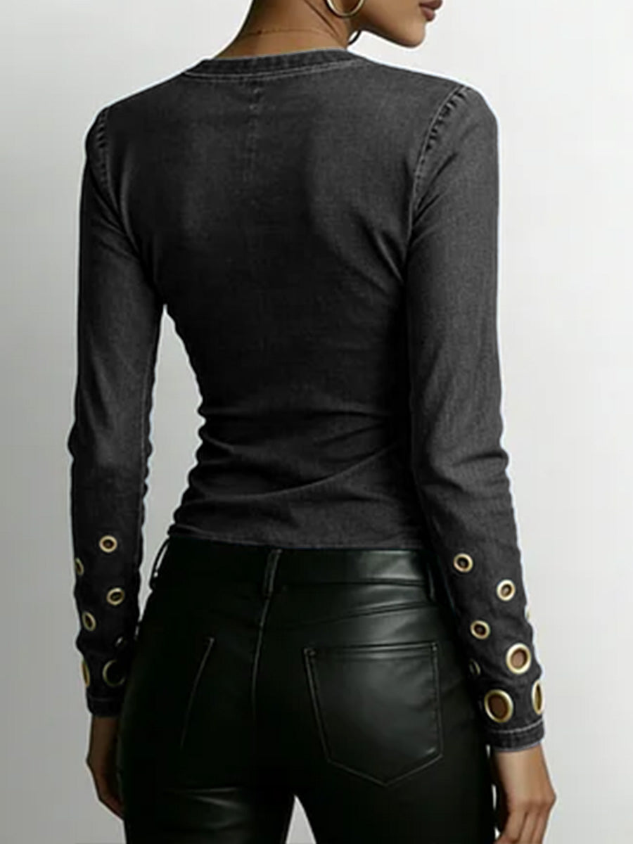 Women's Denim-look V-neck Long-sleeved Casual Loose-fitting Top