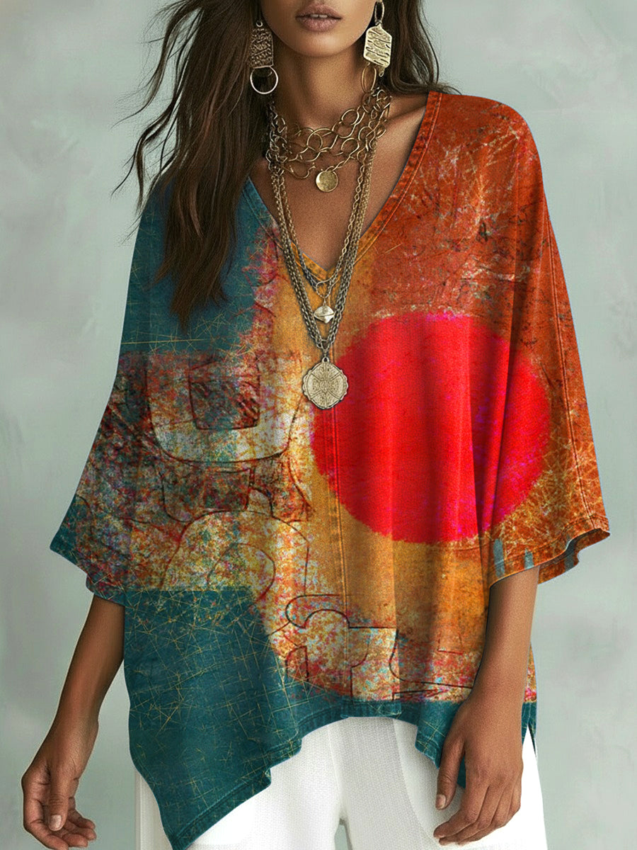 Women's Vintage Abstract Geometry Art Print V-neck Loose Shirt