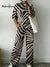 Zebra Stripe Decorative Pattern Casual Stand Collar Long Sleeve Top And Elastic Waistband Pants