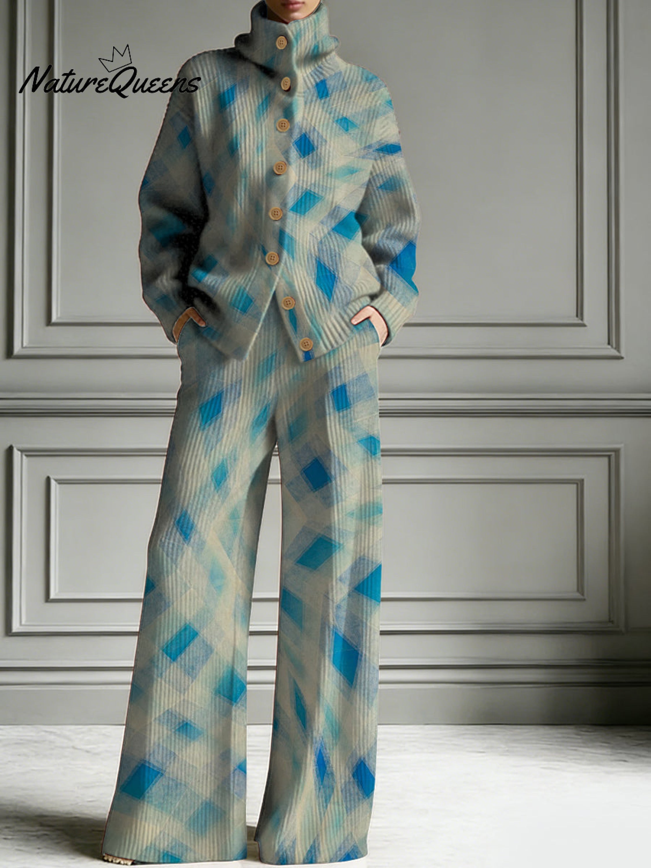 Distorted Plaid Decorative Pattern Casual Stand Collar Long Sleeve Top And Elastic Waistband Pants