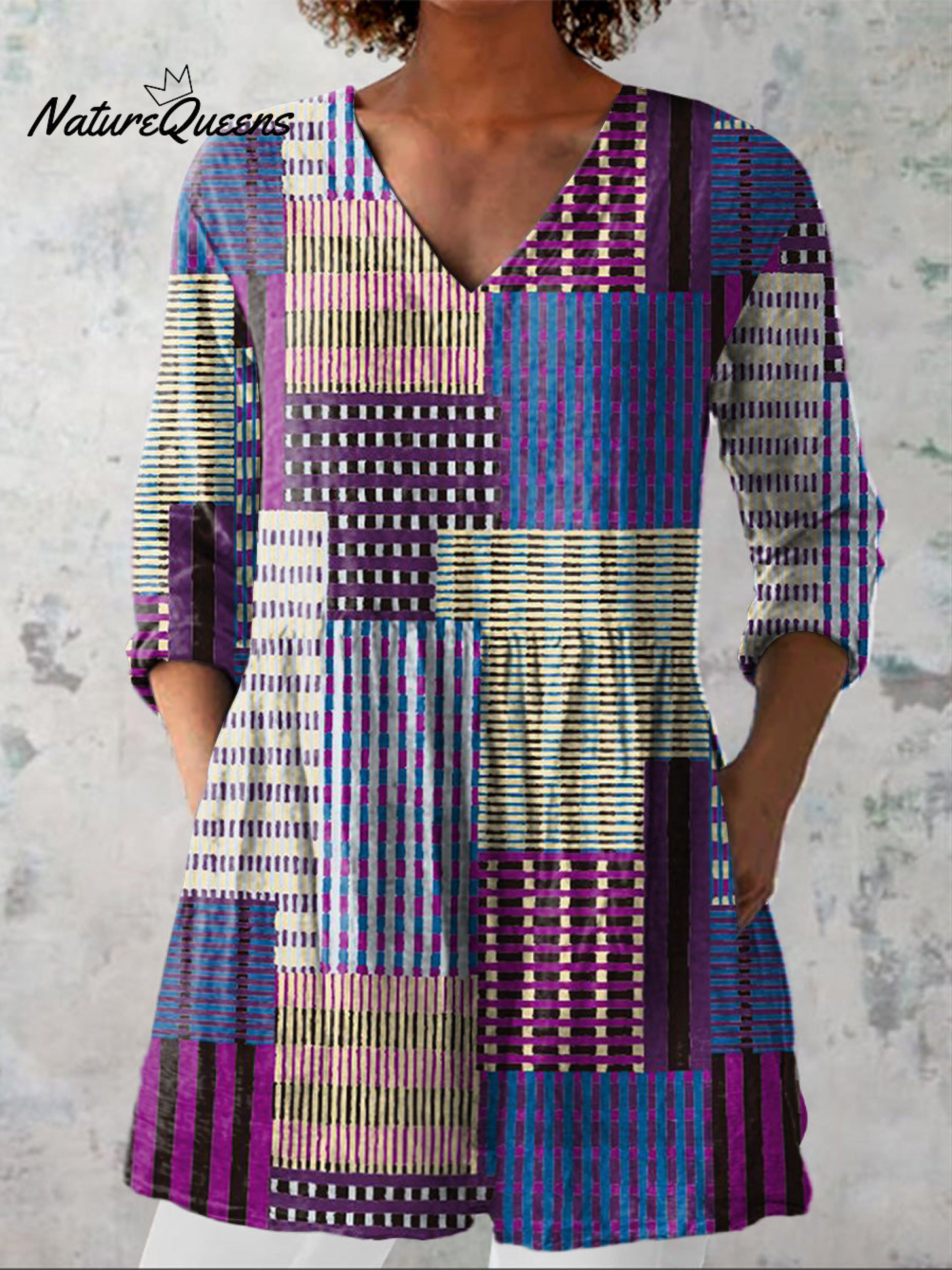 Geometric Architecture Pattern Printed Women's Casual Linen V-Neck Shirt
