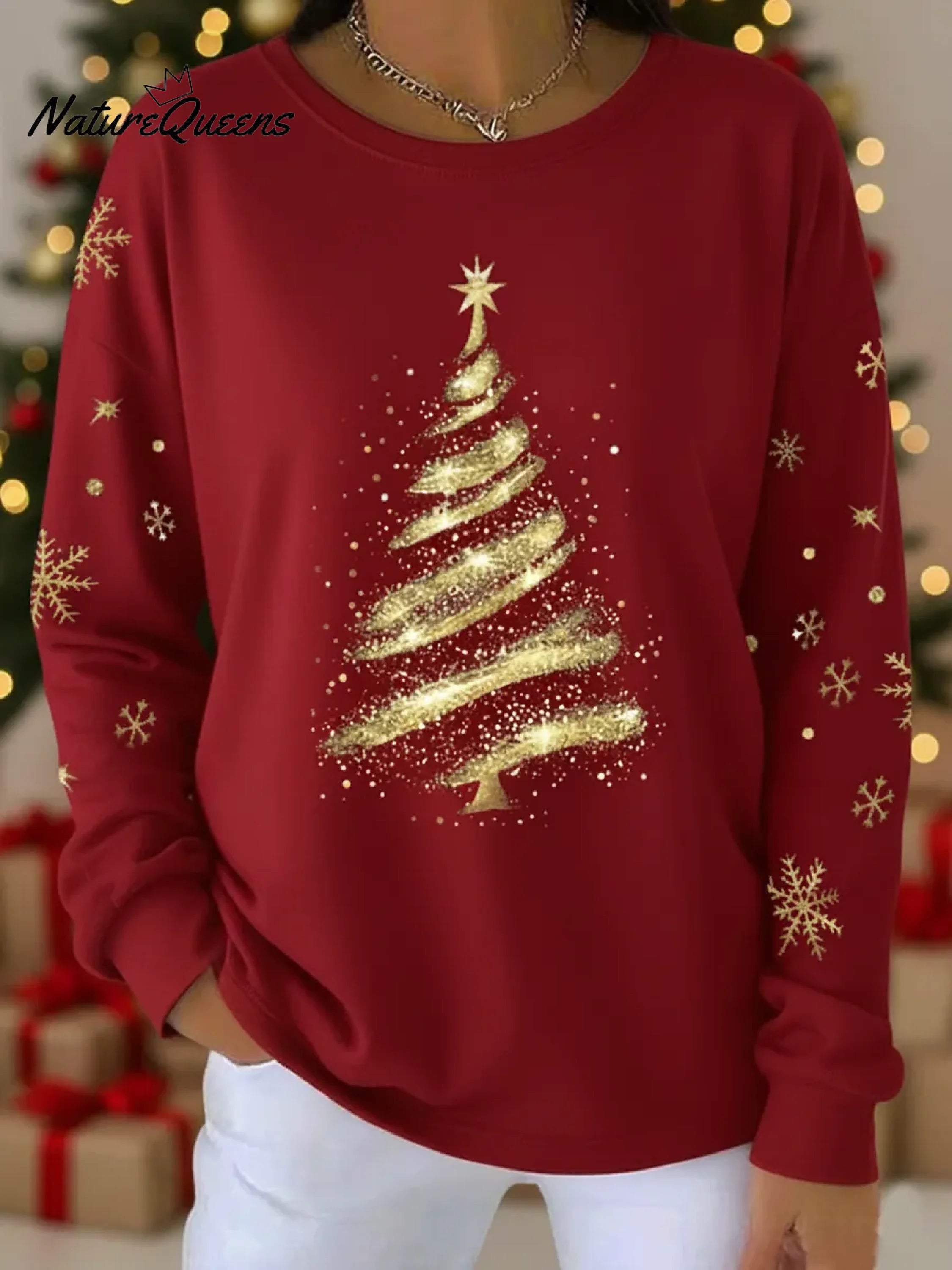 Gold Christmas Tree Print Crew Neck Sweatshirt