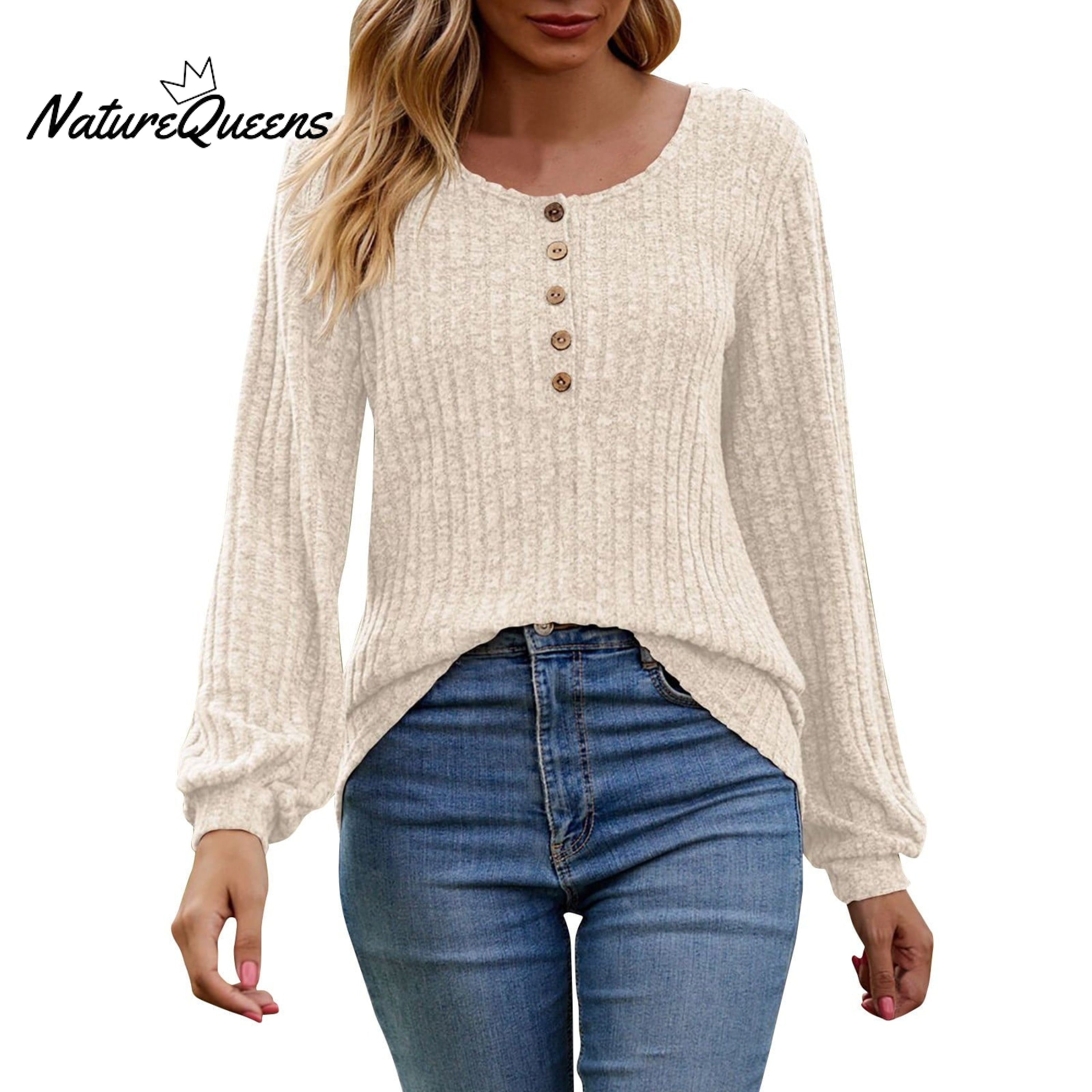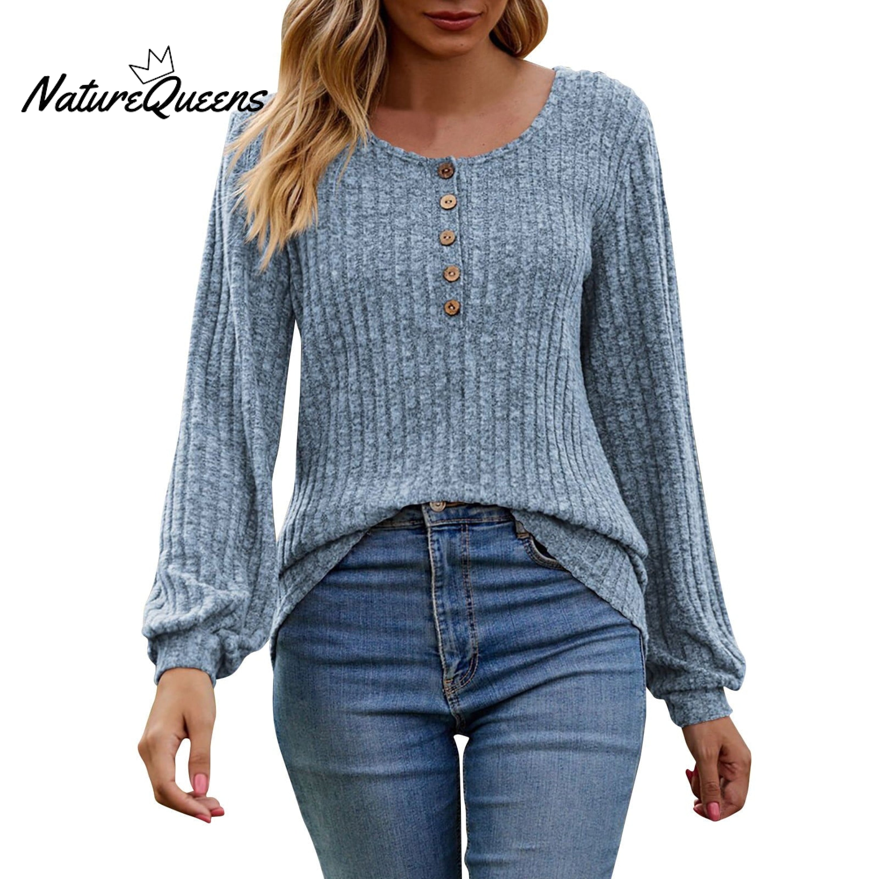 Women's Fall Button Scoop Neck Puff Long Sleeve Henley Shirts