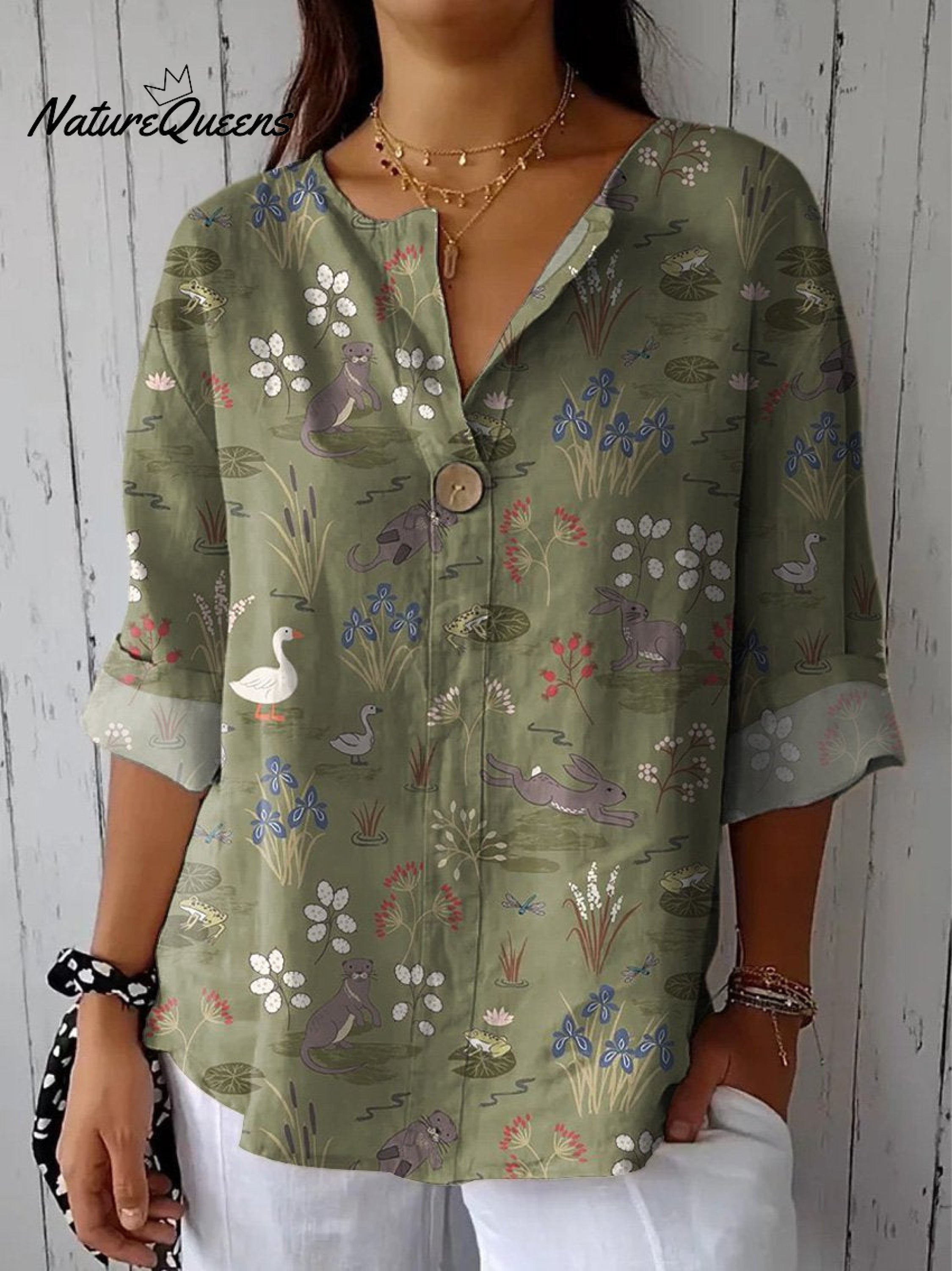 Spring Pond And Animal Pattern Printed Women's Casual Cotton Linen Shirt