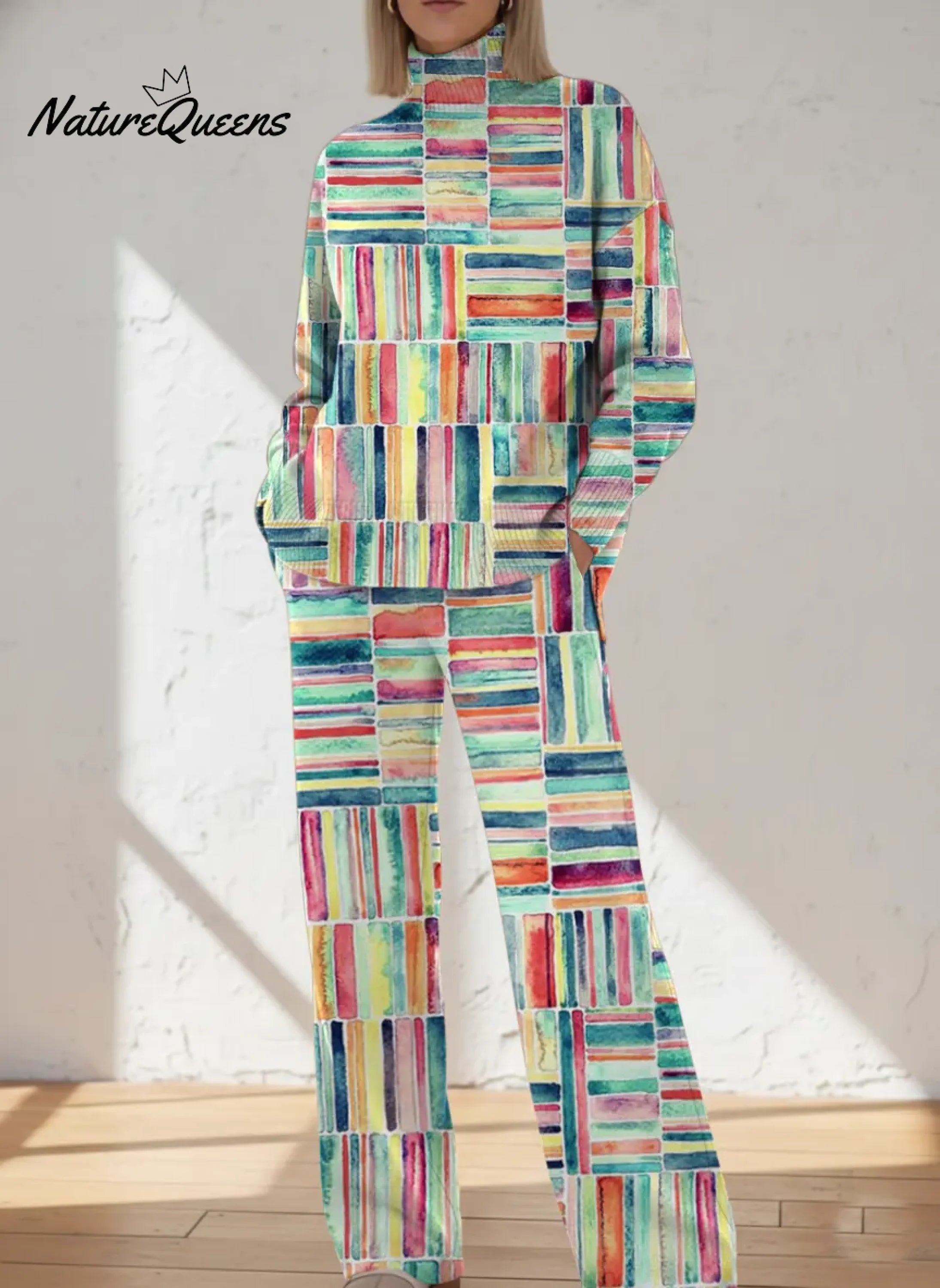 Women's Abstract Pattern Art Print Casual Knitted Cotton Top Pants Suit