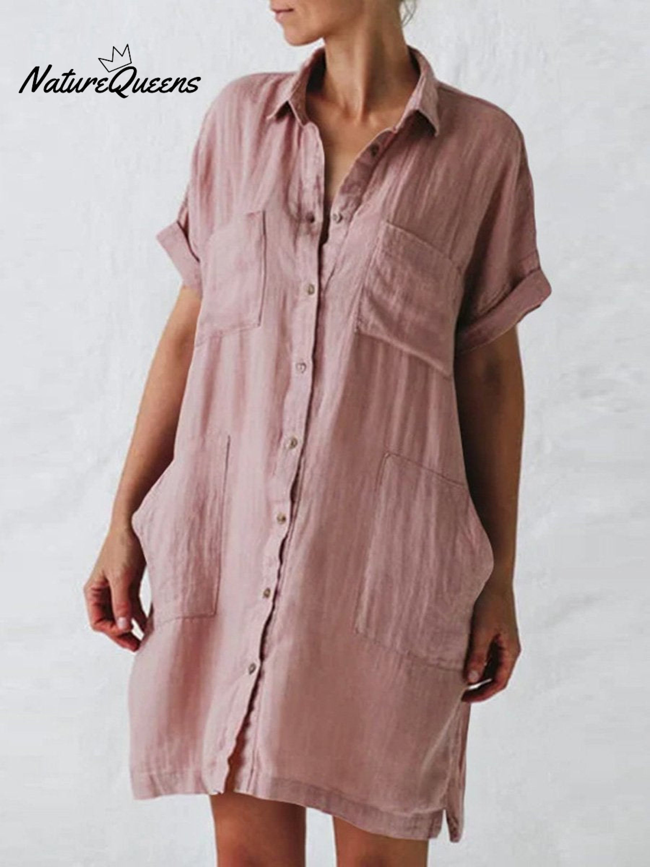 Women's Cotton And Linen Short Sleeve Irregular Pockets Shirt Dress