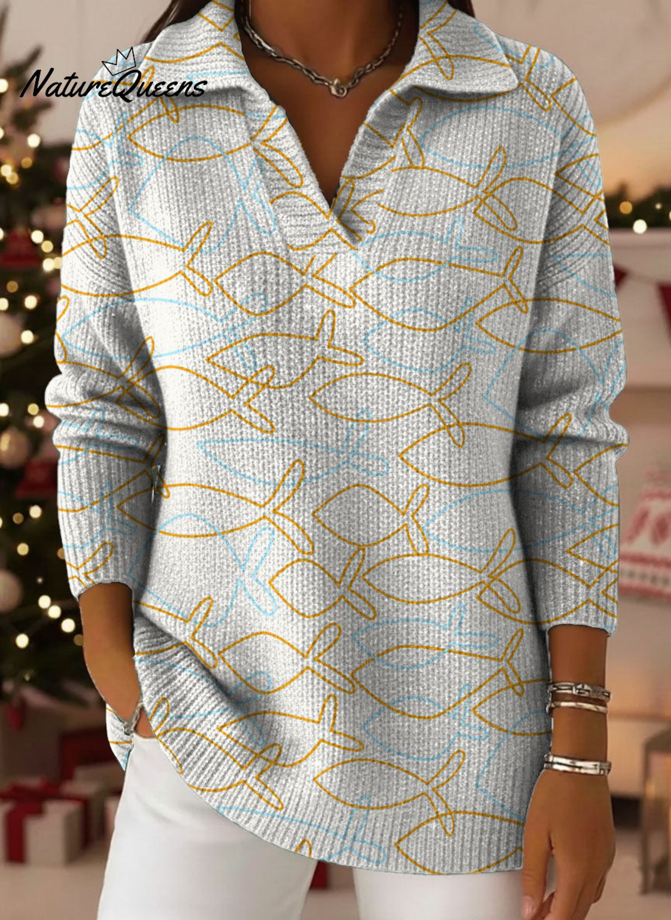Women's Line Drawing Fish Decorative Pattern Casual Shirt Collar Long Sleeve Sweater