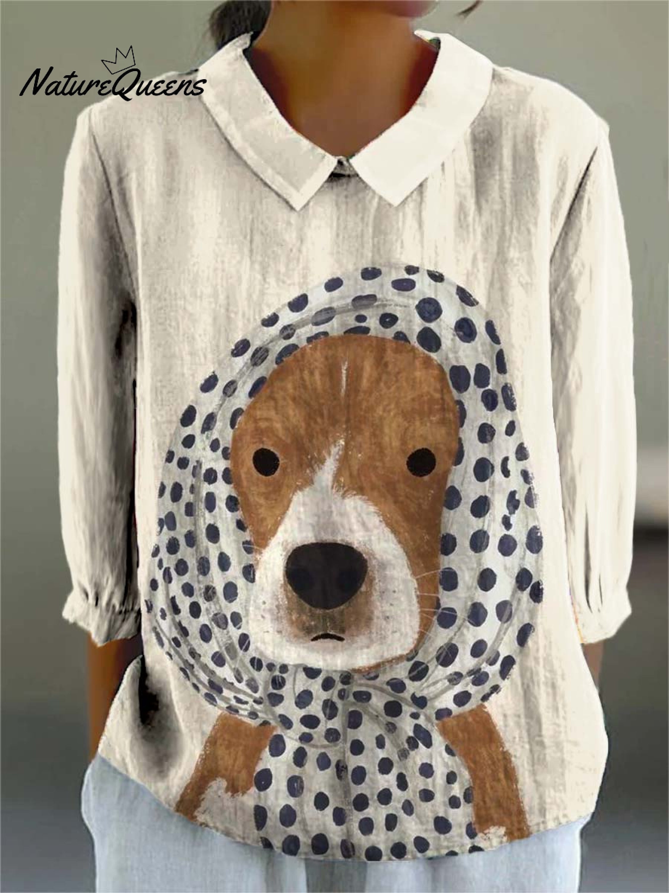 Women's Lovely Dog Art Print Casual Cotton And Linen 3/4 Sleeve Shirt