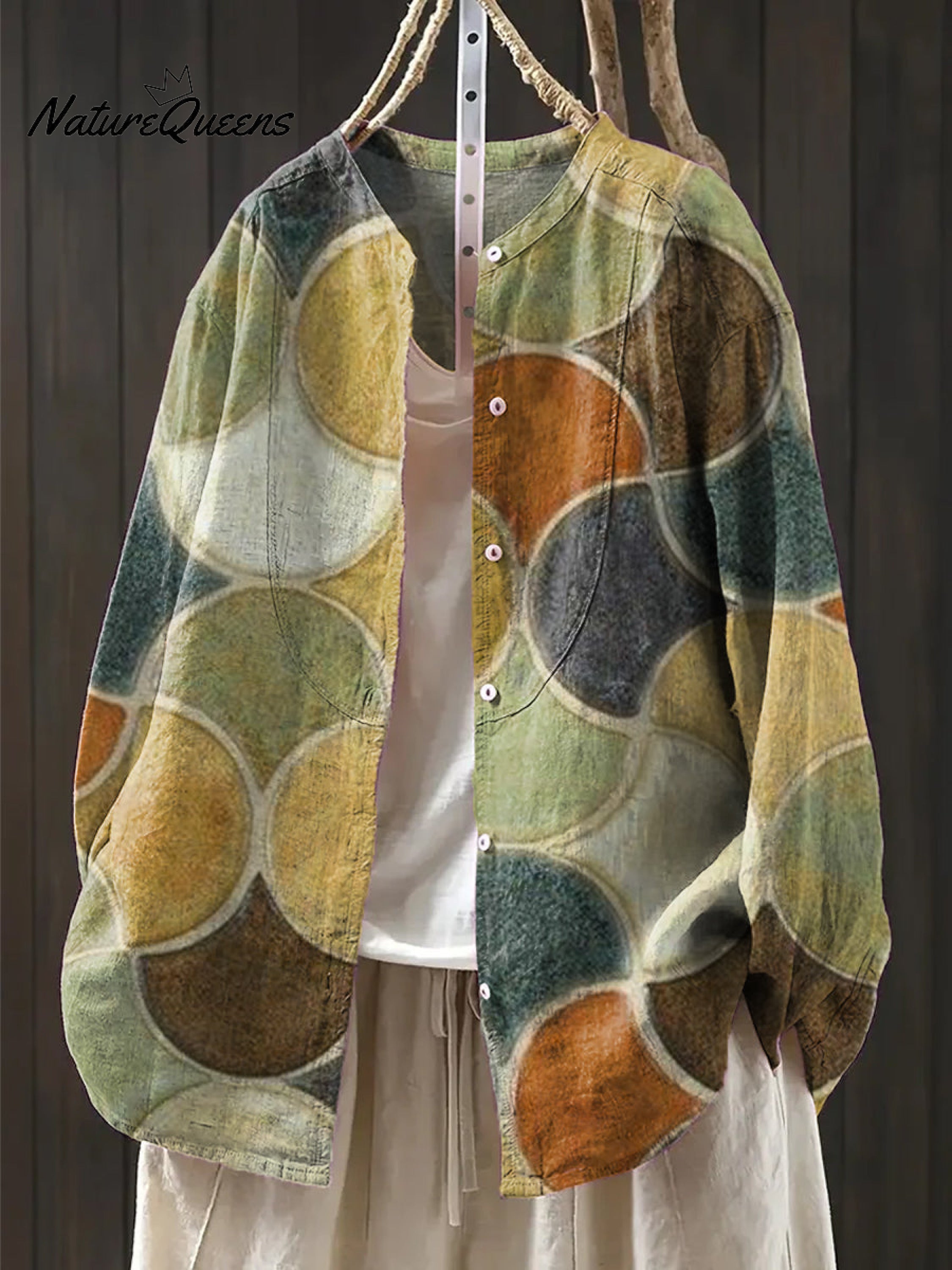 Women's Multicolor Abstract Scalloped Geometric Painting Art Print Casual Cotton And Linen Shirt