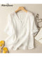 Women's Pink Floral Stripe Painting Art Print Casual Cotton And Linen 3/4 Sleeve Shirt