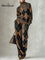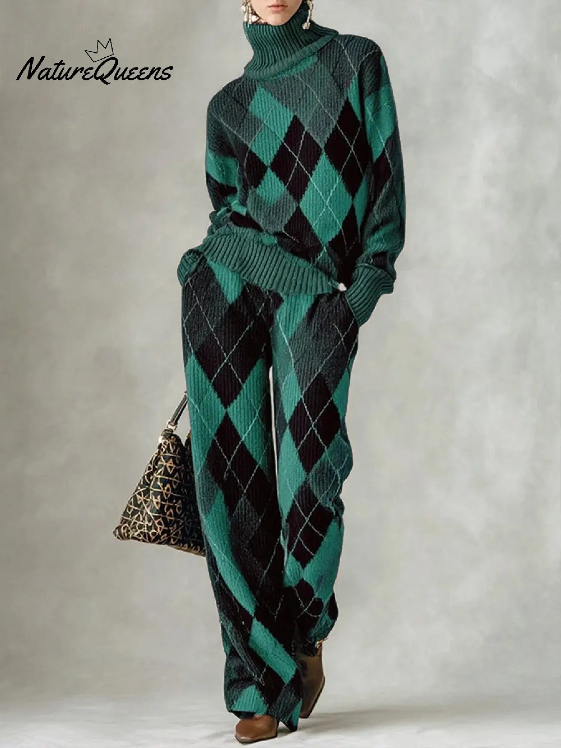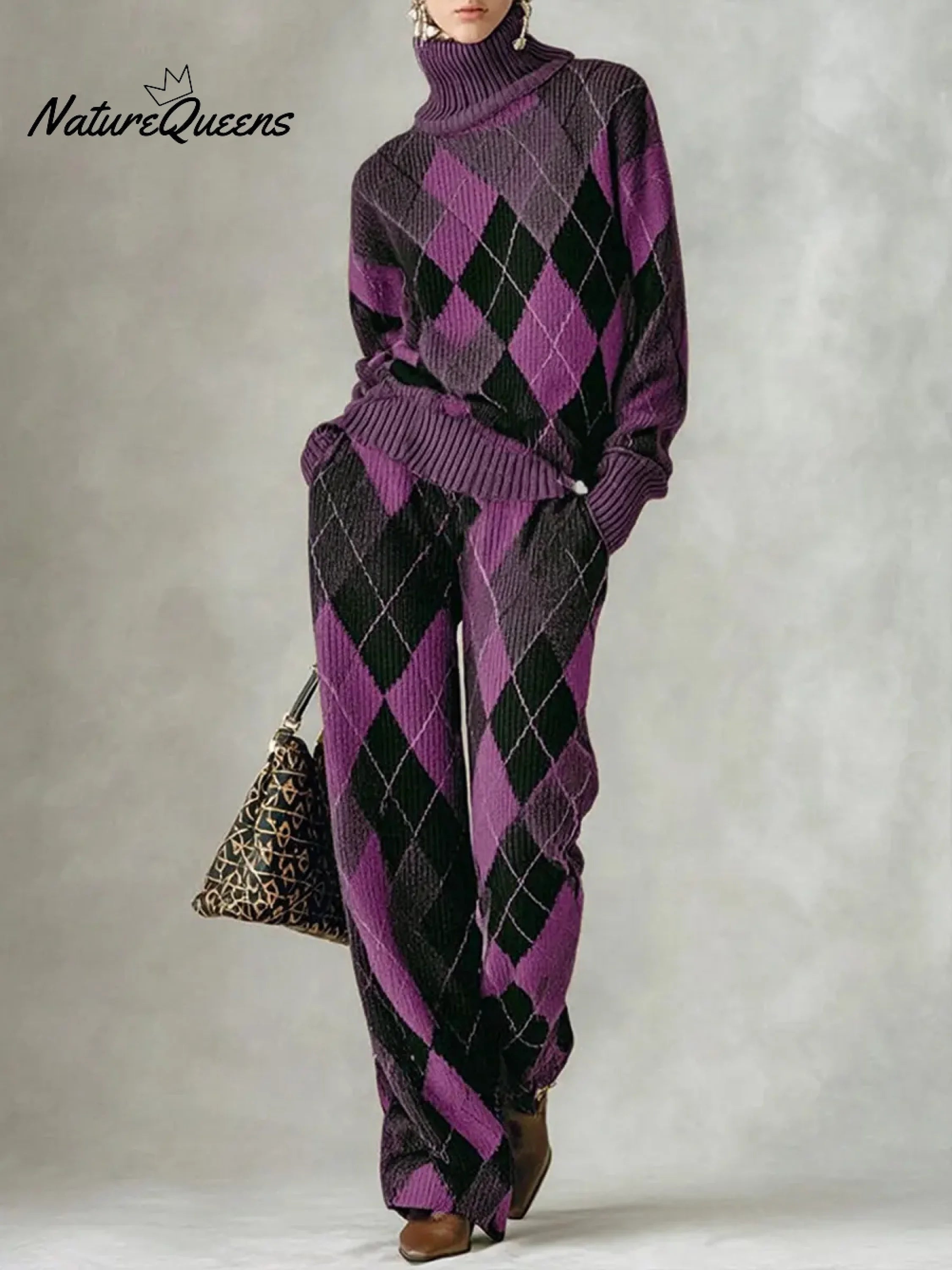 Women's Plaid Print High-neck Long-sleeve Casual Loose Knit Top With Elastic Waist And Wide-leg Pants Set