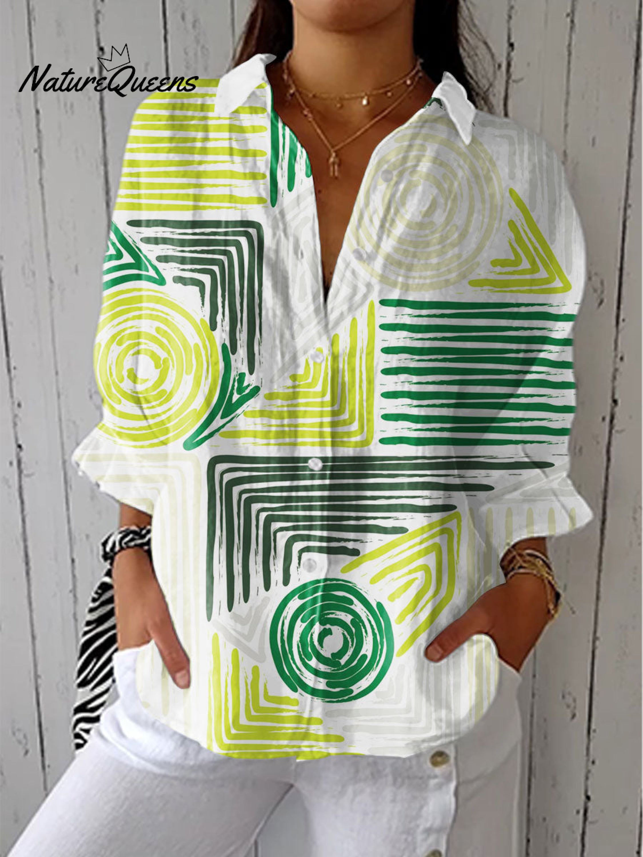 Women's Retro Abstract Geometric Texture Art Print Casual Linen V-neck Shirt