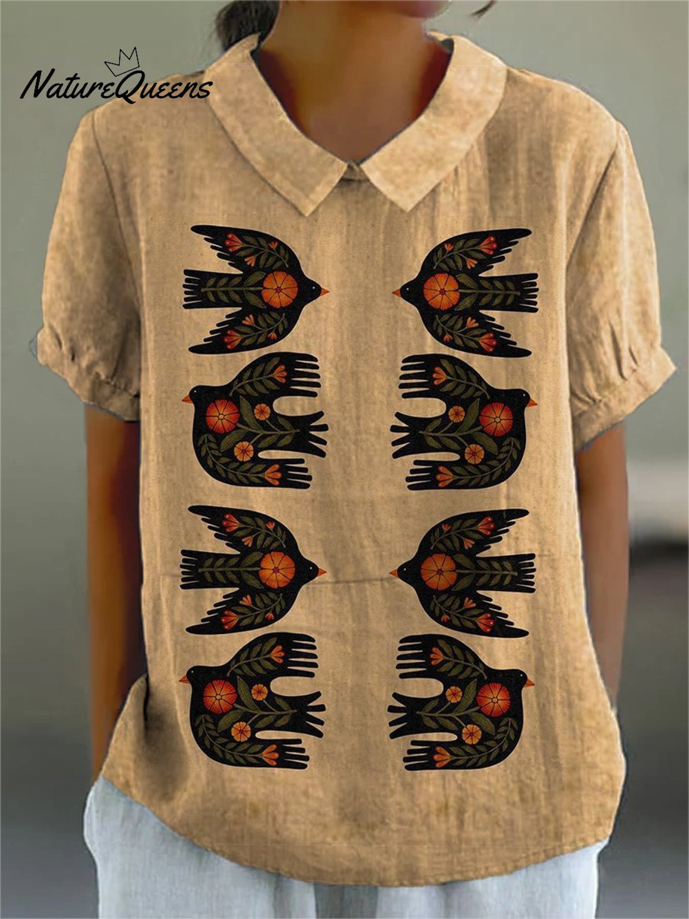 Women's Retro Bird Print Casual Cotton and Linen 3/4 Sleeve Shirt