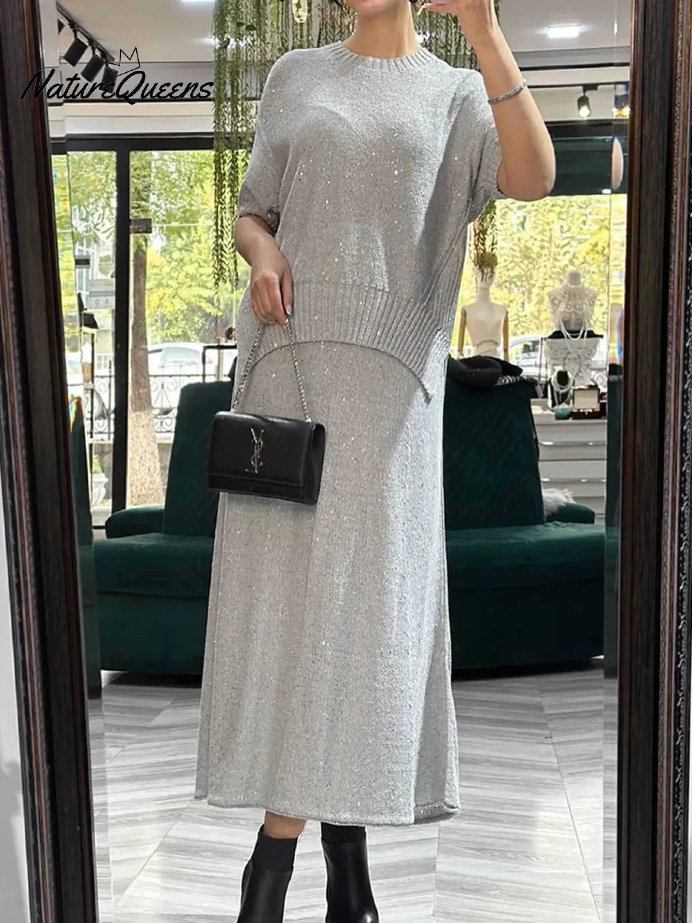 Women's Shiny Knit Top And Skirt Two-piece Set