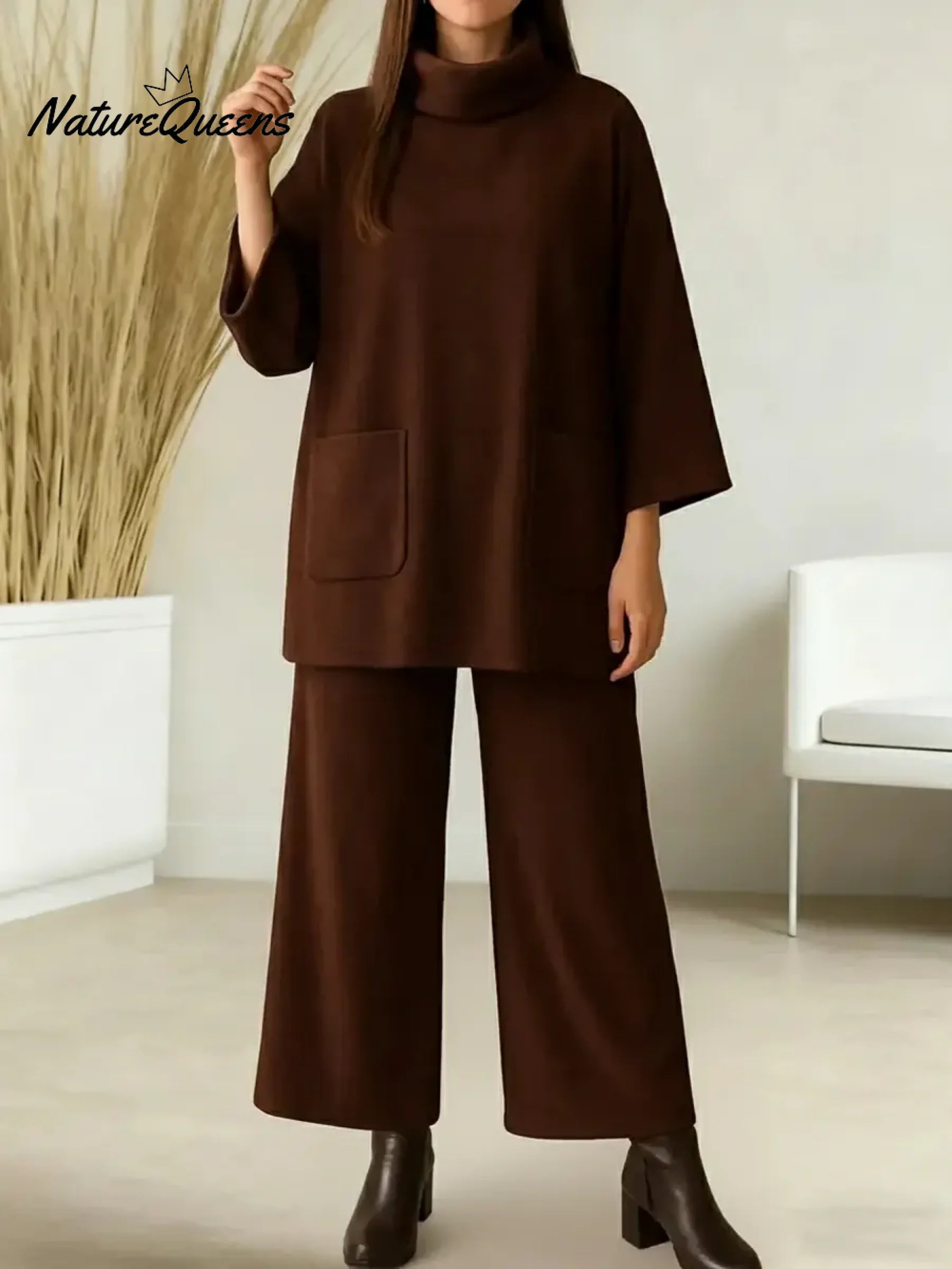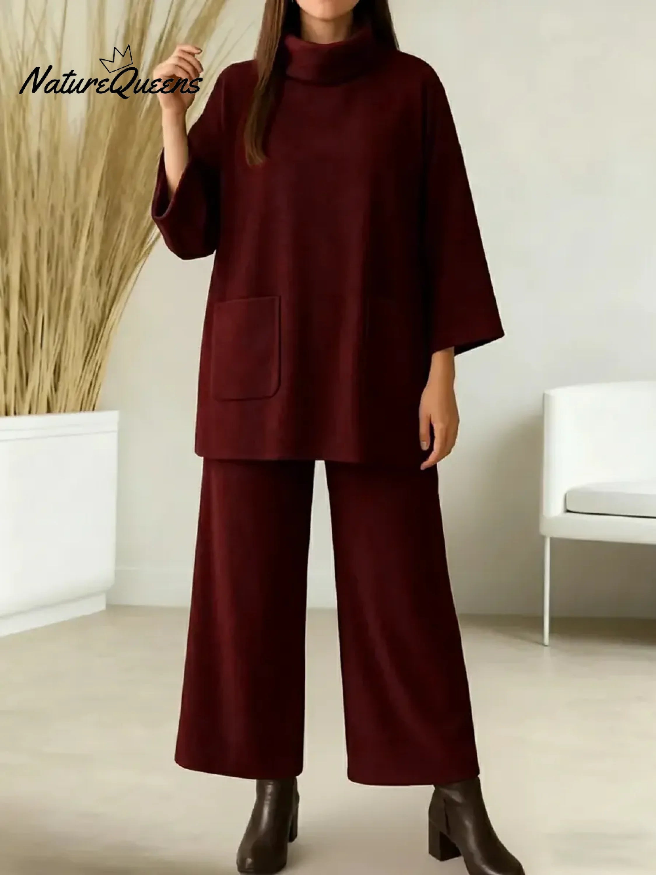 Women's Solid Color High-neck Long-sleeved Casual Loose Top With Elastic Waist And Wide-leg Pants Autumn/winter SetWomen's Solid Color High-neck Long-sleeved Casual Loose Top With Elastic Waist And Wide-leg Pants Autumn/winter Set
