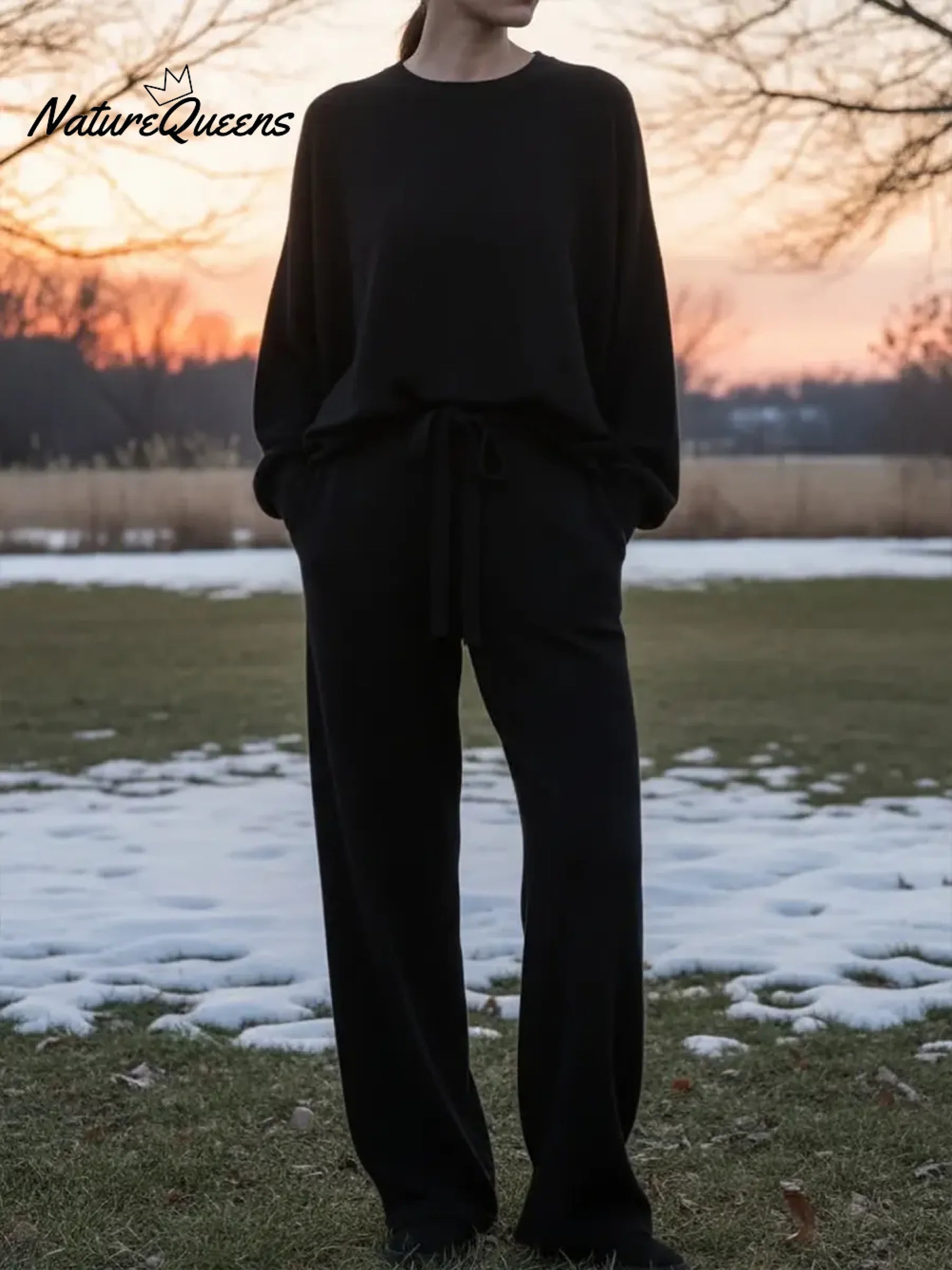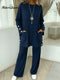 Women's Solid Color Round Neck Long Sleeve Casual Loose Top with Elastic Waist and Wide Leg Pants Set