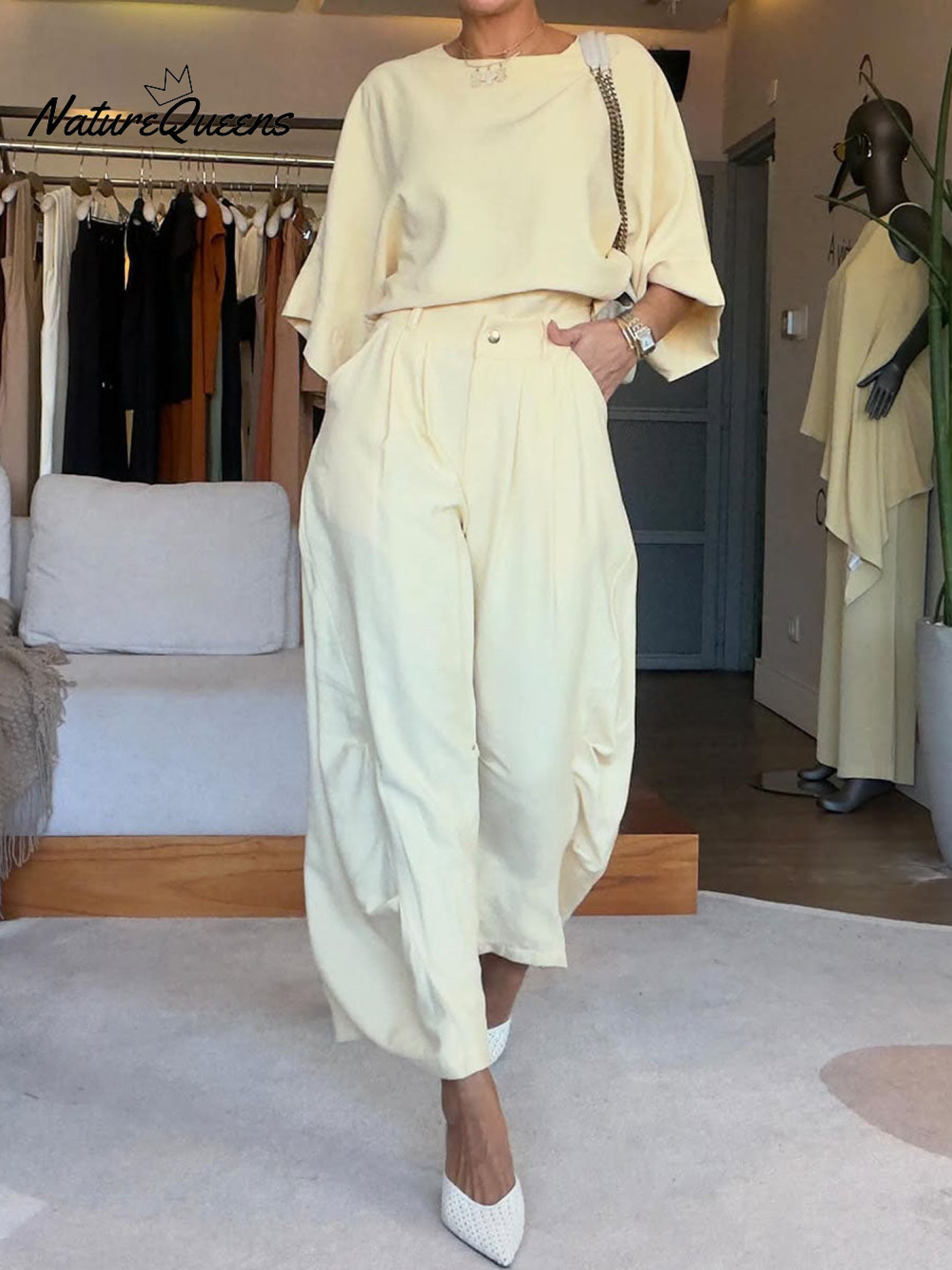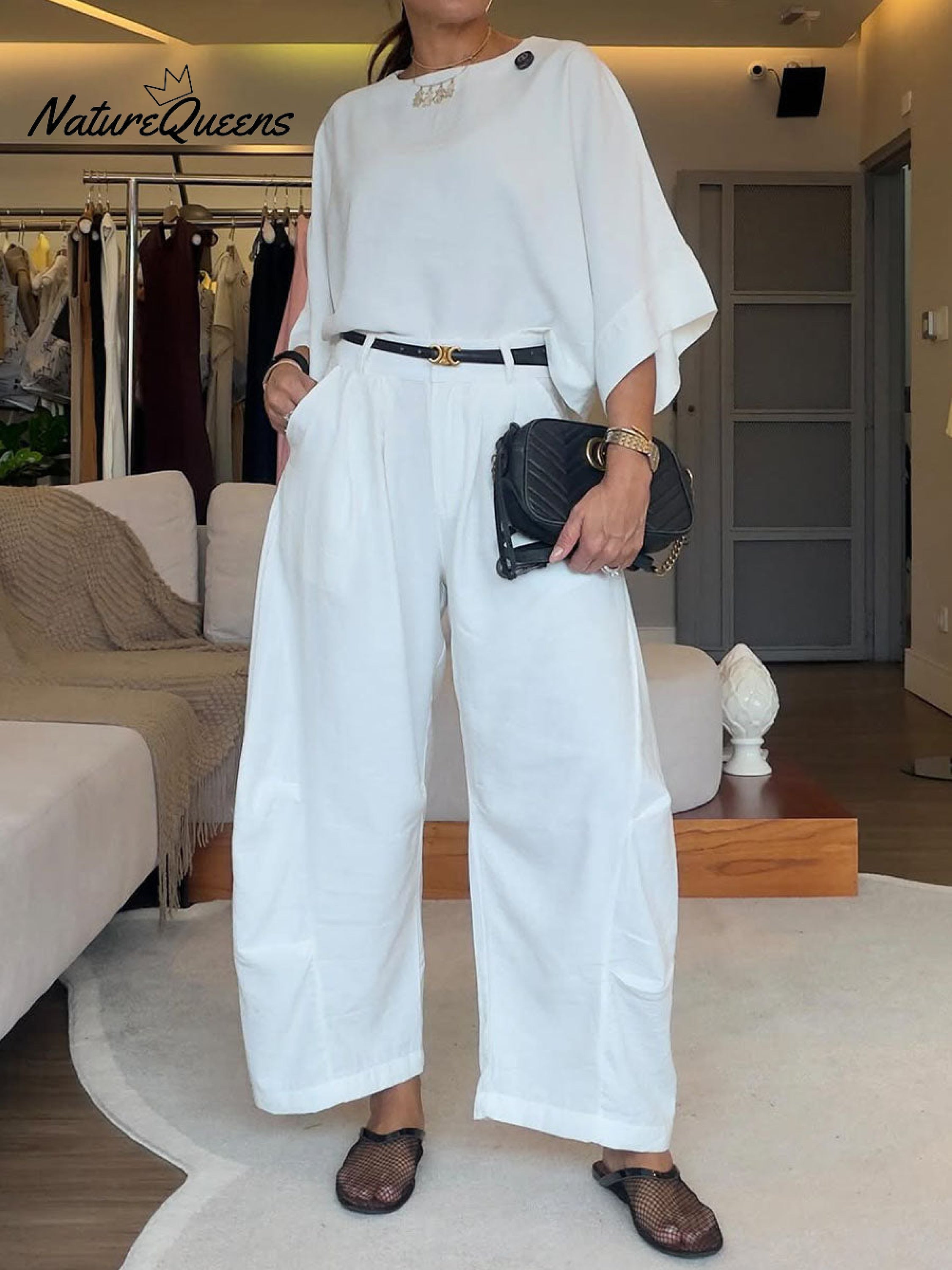 Women's Solid Color Round Neck Three-quarter Sleeve Casual Loose Top And High-waisted Casual Loose Wide-leg Pants Cotton Set.