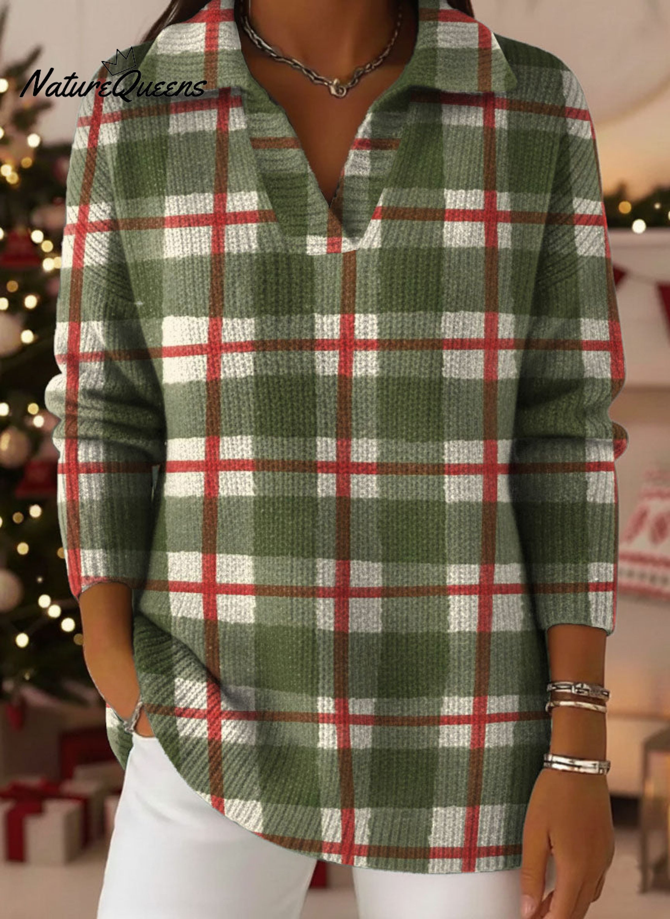 Women's Striped And Checkered Decorative Patterns Casual Shirt Collar Long Sleeve Sweater