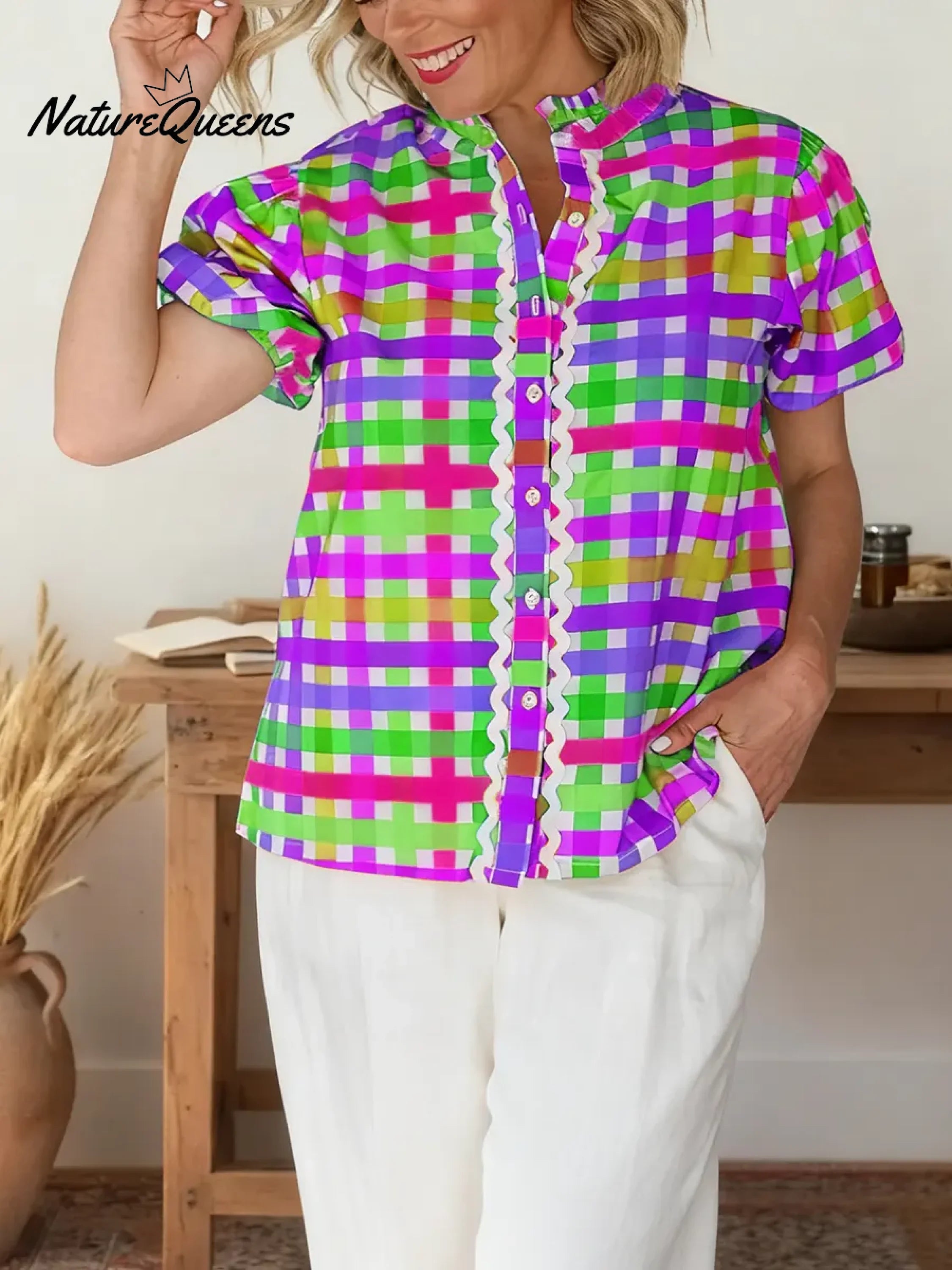 Women's Striped Print Shirt Collar Short Sleeve Casual Loose Cotton Linen Top