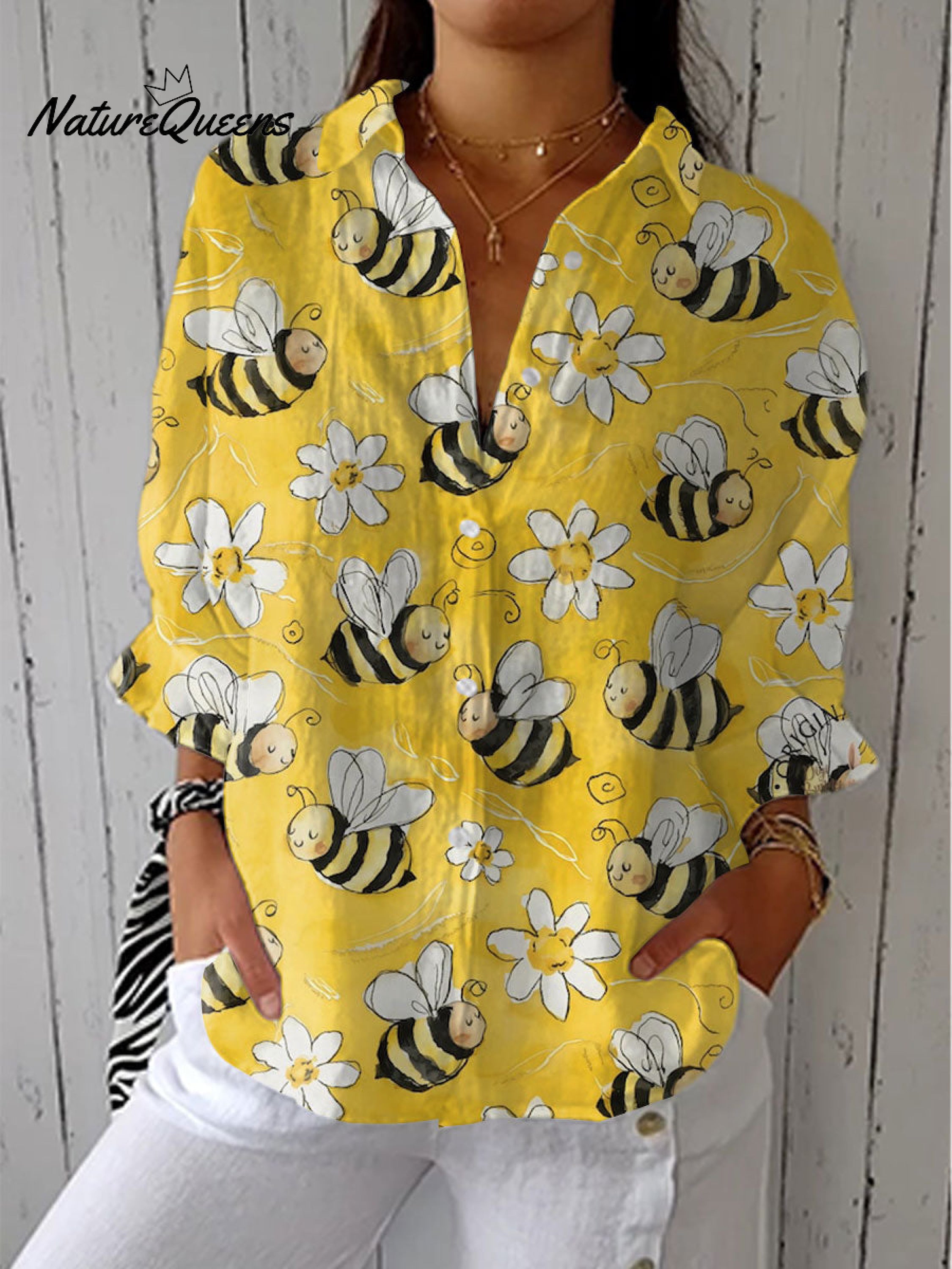 Women'sVintage Bee Flower Art Print Casual Linen V-neck Shirt