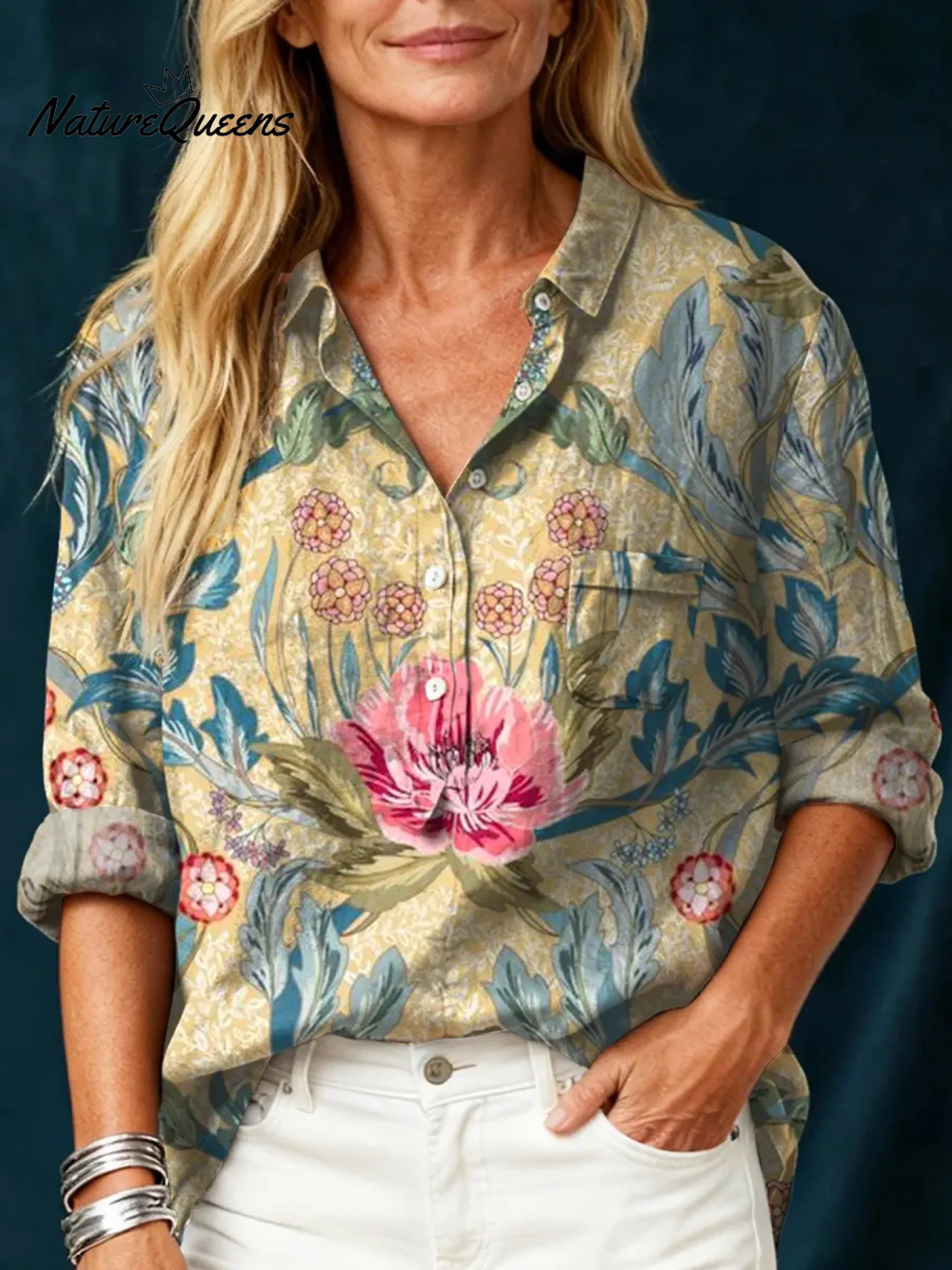 Women's Vintage Flower Art Print Casual Cotton And Linen Shirt