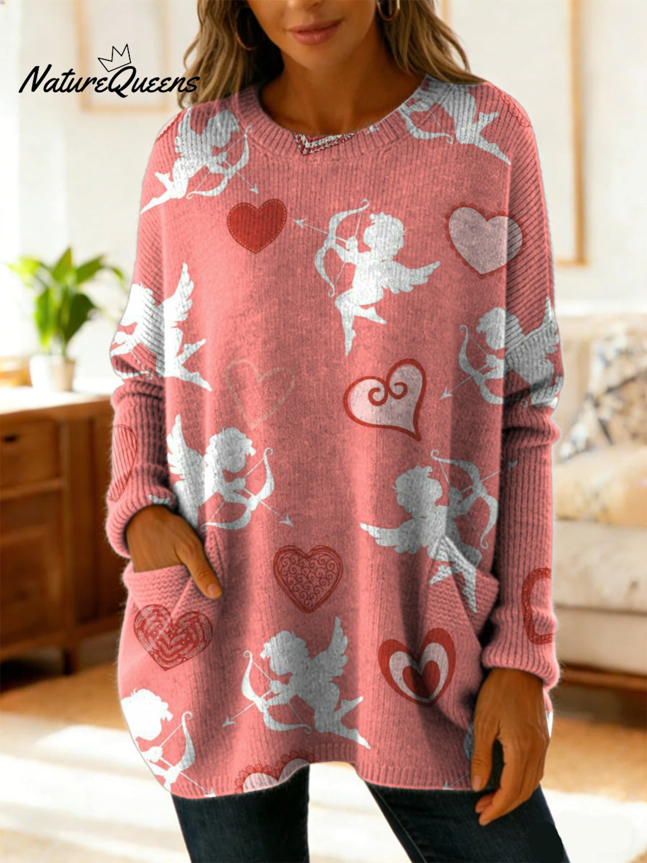 Valentine's Day Cupid Angel Decorative Pattern Women's Casual V Collar Long Sleeve Sweater